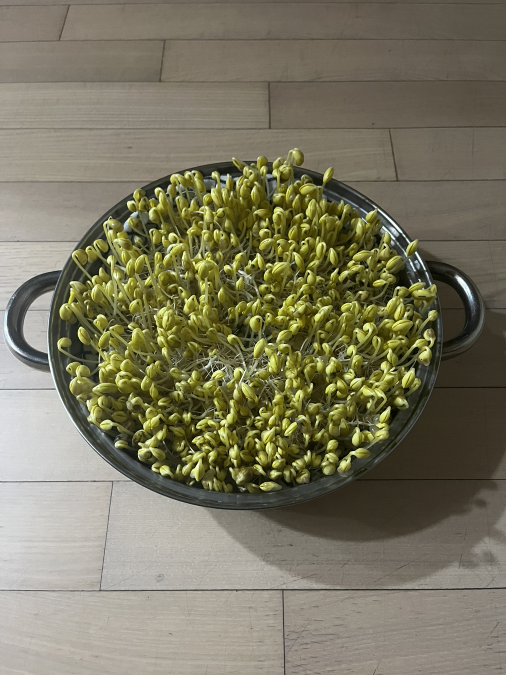 며칠 전 유 선생이 알려준 대로 콩나물 키우기를 시작하여 다섯 낮밤이 지나 어였한 완숙콩나물이 되었다.