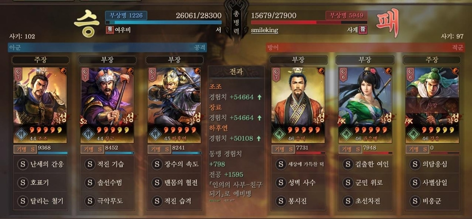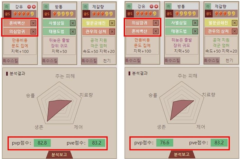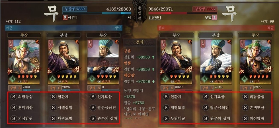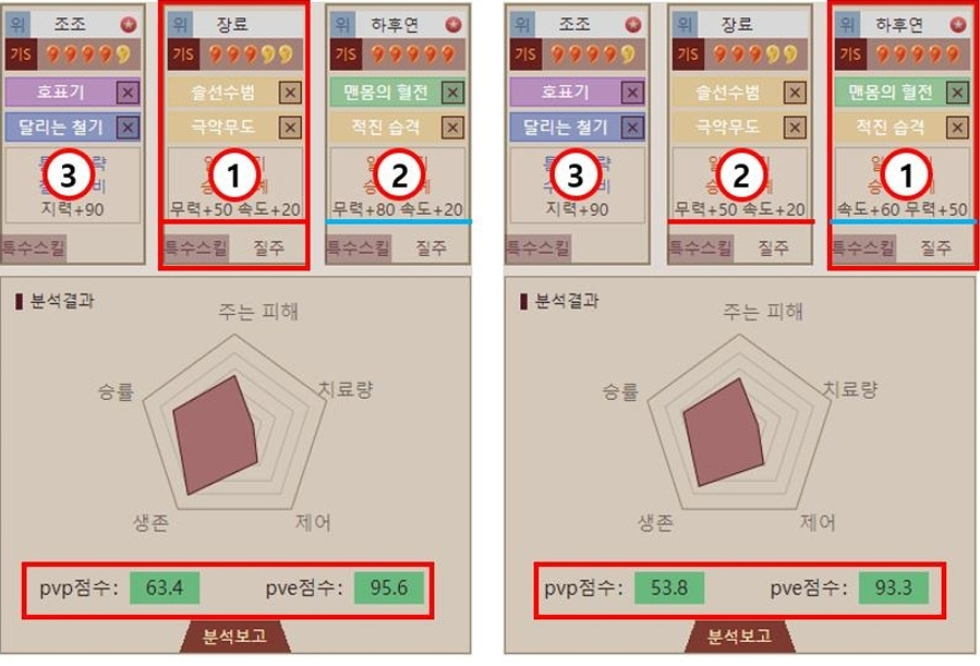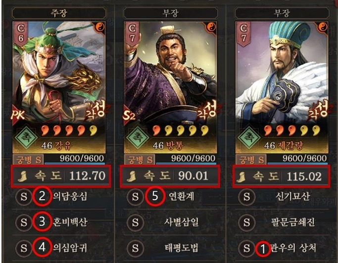 레드팀 강유의 속도가 블루팀 강유보다 높아 선공권을 가져갔고 디버프를 먼저 넣은 로그를 확인할 수 있다. 이처럼 장수 속도 속성에 따라 선공권이 달라져 누가 먼저 전법을 사용함에 따라 승패가 결정될 수 있다.