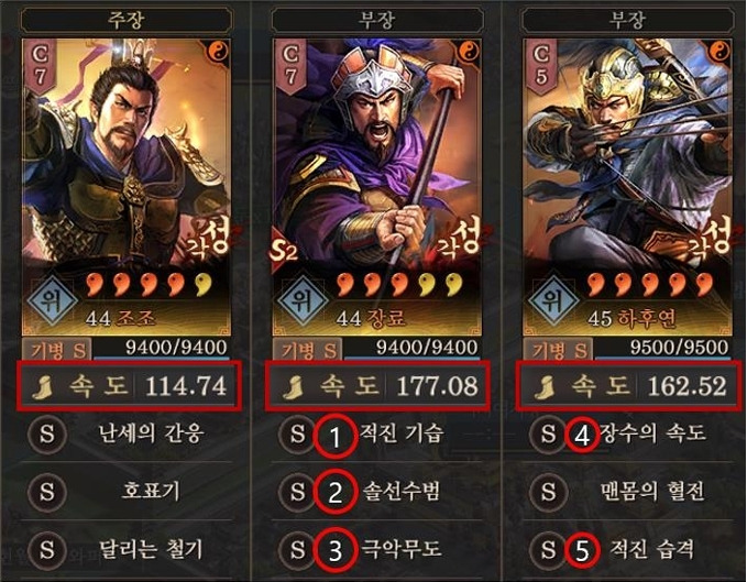 위의 장수 속도 '헤드샷 기병덱' 전법으로 장료와 하후연의 속도만 바꿔 시뮬레이션을 돌려보았다.