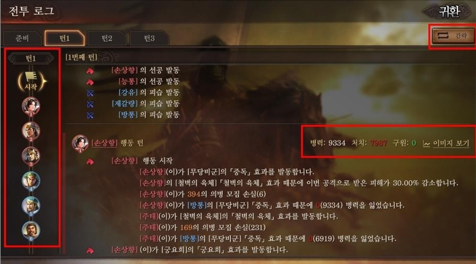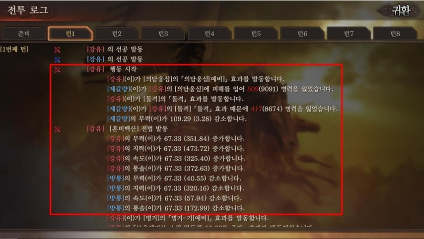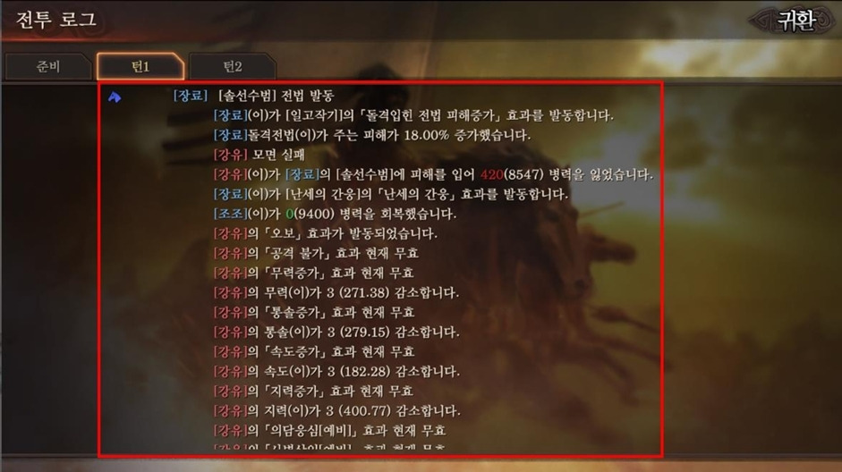 준비 턴부터 마무리 턴까지 모든 전투 로그가 상세히 나오고 로그를 통해 전투 결과의 원인을 알아낼 수 있다.