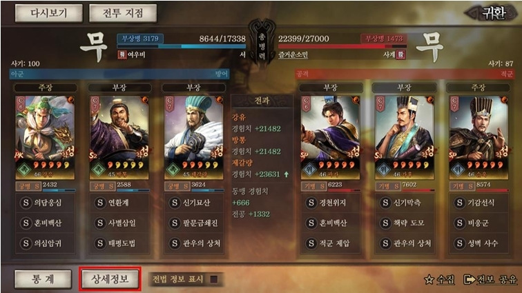 전보 좌측 하단 상세정보 탭을 들어가면 상세 전투 로그 확인이 가능하다.