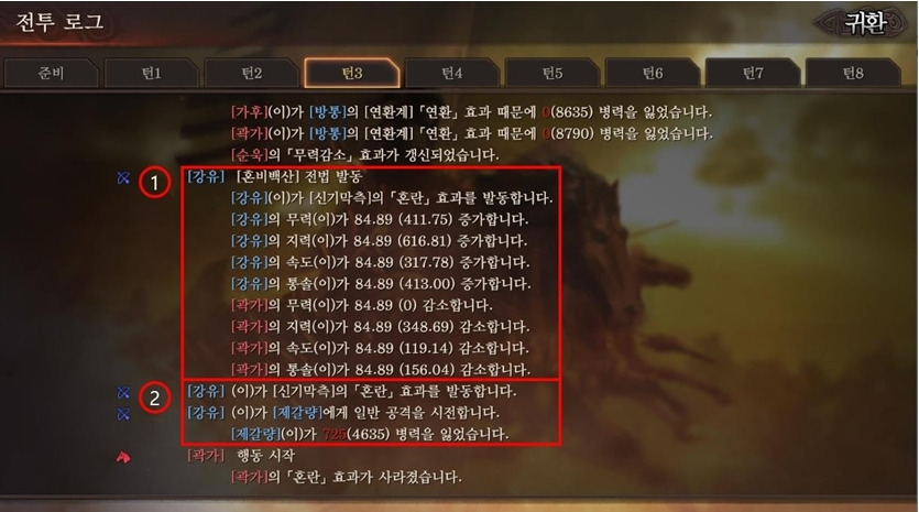 2. 강유가 가후의 '신기막측' 혼란 효과를 받아 아군 제갈량에게 일반 공격을 시전 하여 병력을 잃은 로그다.