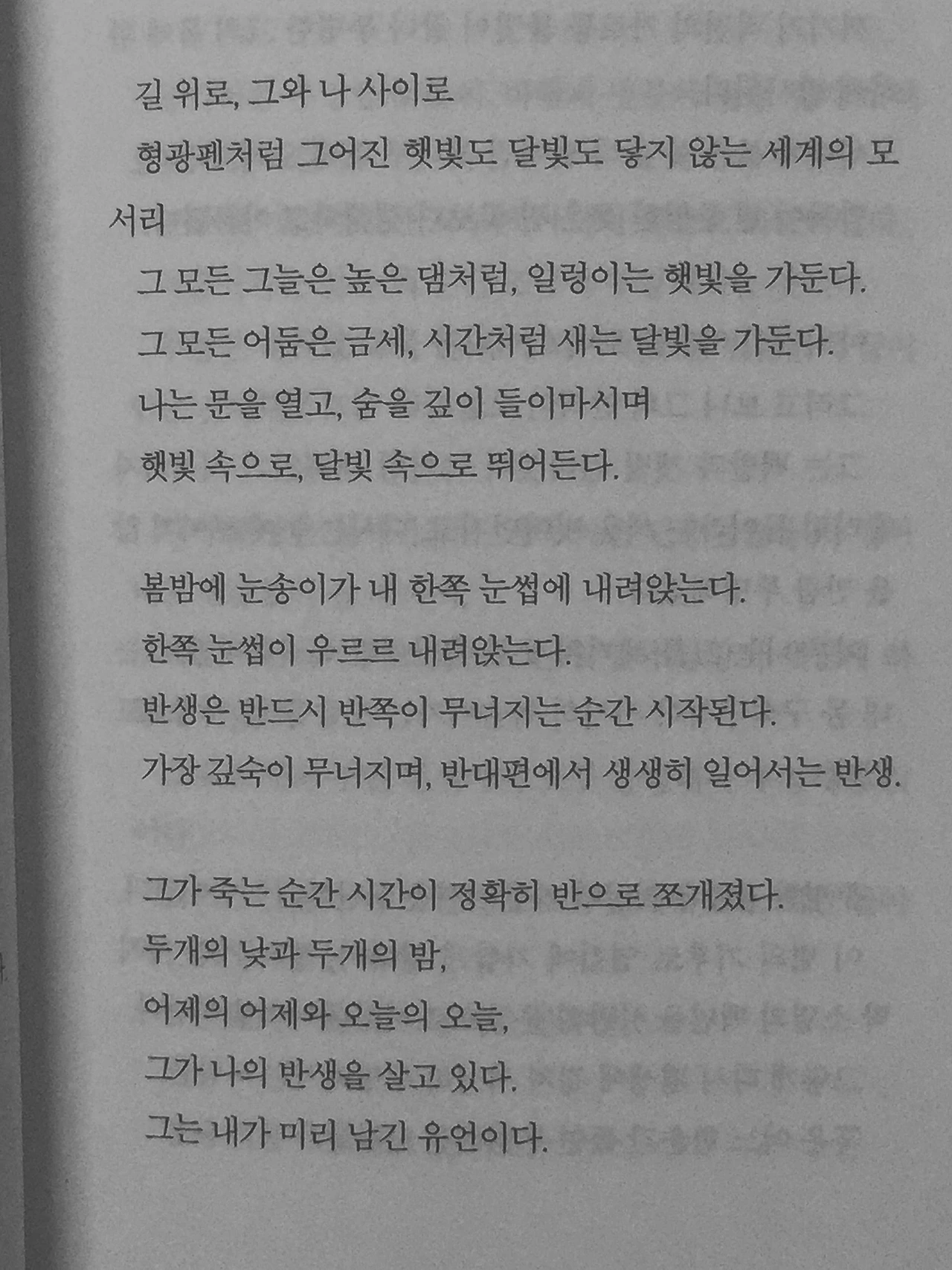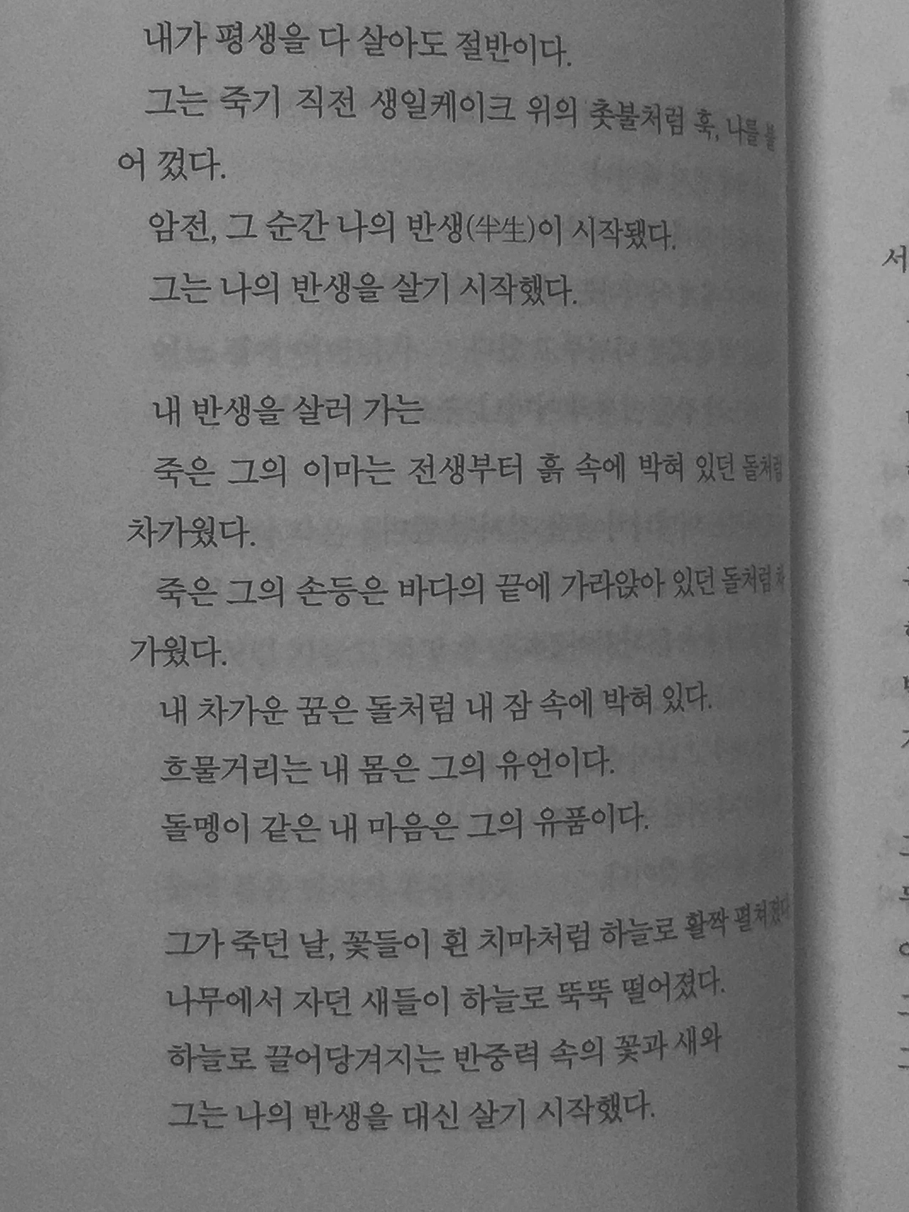 제게 당신은 오르페우스처럼 다가왔습니다. 당신은 이 시집에서 애도하는 죽음은 하나이자 둘이며, 둘이자 하나처럼 보입니다. 우선 아버지의 죽음입니다. "그는 내가 미리 남긴 유언이다"로 끝나는 「반생」는 가슴이 먹먹하다는 표현이 참 부족하다는 생각을 하게 합니다. 당신의 유언에 사족을 붙이는 행위는 예의가 아니라고 생각합니다. 다만 위의 표현을 하게 하는 시를 밑에 한 편 더 적어보았습니다.