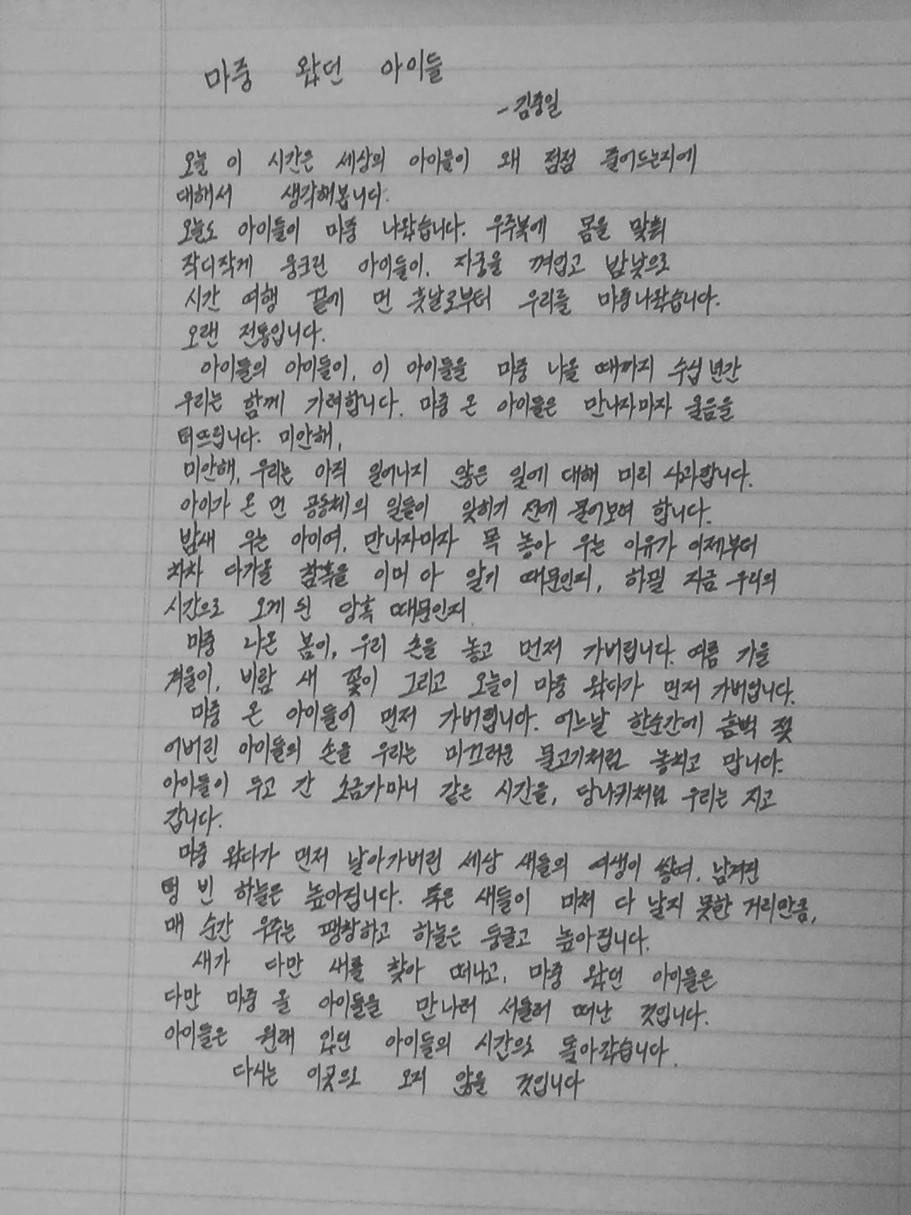 우리는, 우리는 이 아이들이 누군지 압니다. 그러나 우리는 단순한 복수형이 아니라 고유명사가 되어버린 그들을 너무 종종 잊는 듯싶습니다. 그래서 당신은 "어느 날 한순간에 흠뻑 젖어버린 아이들의 손을" 우리가 "미끄러운 물고기처럼 놓치고 맙니다"라고 노래합니다. 이에 더해 "아이들이 두고 간 소금가마니 같은 시간을, 당나귀처럼 우리는 지고 갑니다"라고 노래합니다.