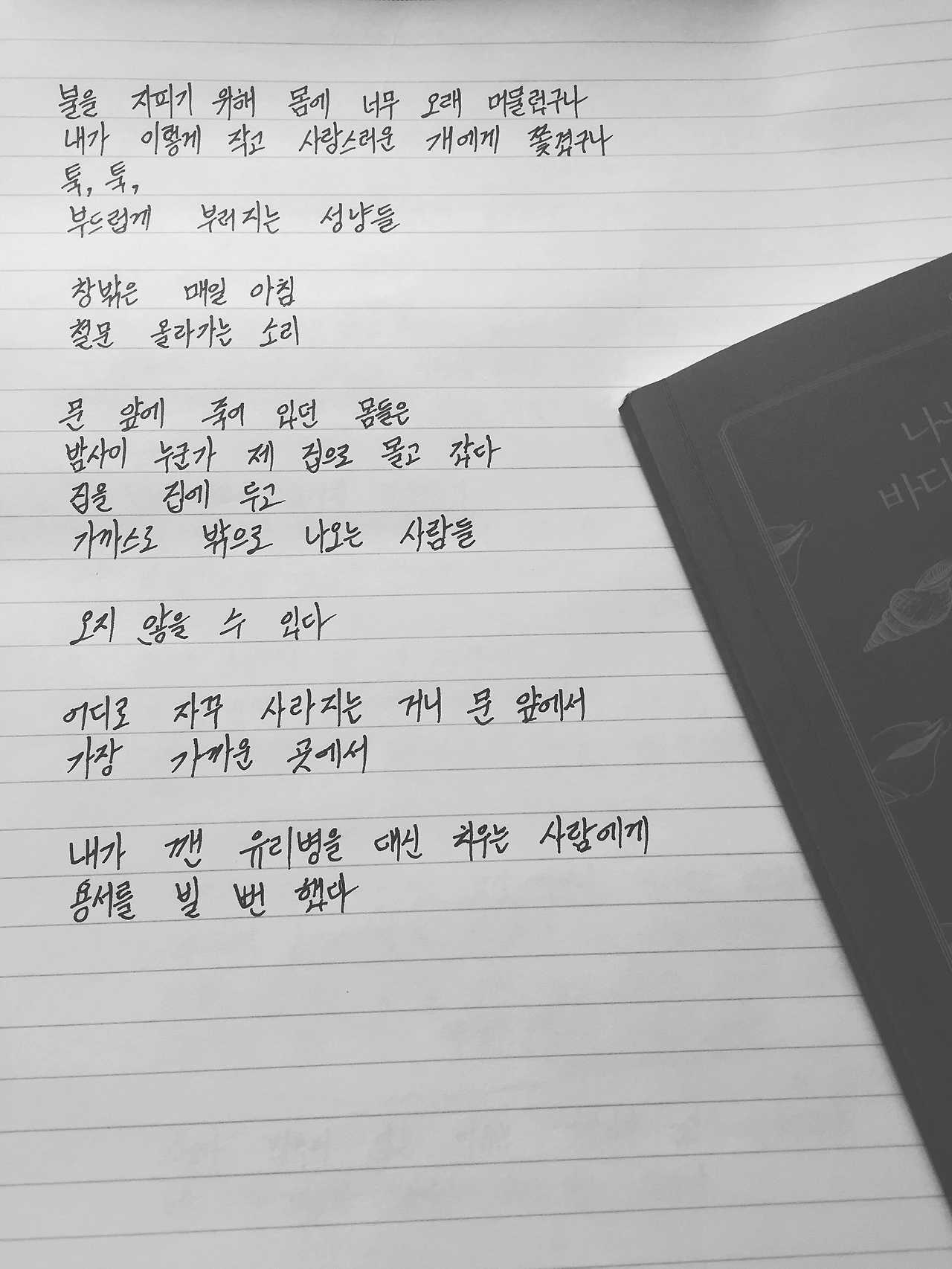 그래서 당신은 쓰는 동안 어떤 것도 외면하지 못합니다. 그게 당신은 "두렵고 자랑스러운 날들"이었을까요. 나는 아직까지 두렵기만 합니다. 그래서 이어서 "내가 이렇게 작고 사랑스러운 개에게 쫓겼구나"와 "어디로 자꾸 사라지는 거니 문 앞에서 가장 가까운 곳에서"는 읽을 때마다 매번 내가 이 시집을 너무 주관적으로 읽고 있나 의심할 정도로 감동을 하는 구절입니다. 그러나 아직 익숙해지려면 멀었다고 생각합니다.