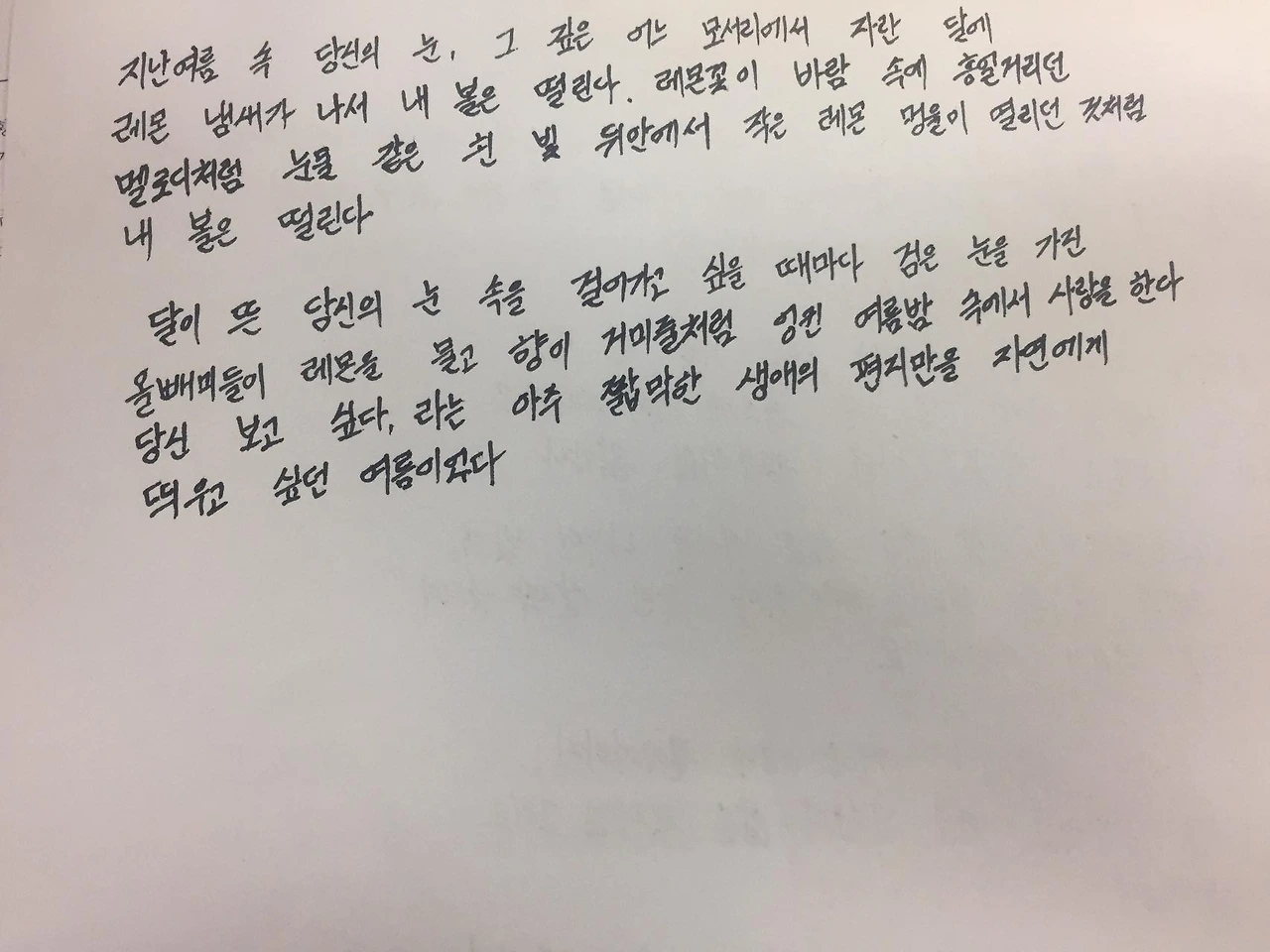 시인은 그 감정을 끝까지 이어간다. 이제 시점은 "새로 온 여름"이다. 생강을 해보니 "그 어깨를 안아준 적이 없었다." 얼마나 후회가 깊었던 걸까. 시인은 "후회한다"라는 감정에 한 행을 내어준다. 습작을 하다가 보통 이런 감정에 한 행을 다 내주면 작위적이거나 시인 혼자만 감정을 끌고 나간 느낌을 주게 된다.