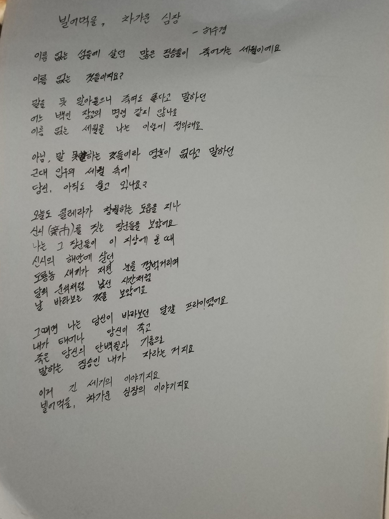 시인은 아파한다. 왜냐하면 우리의 역사는 폭력의 역사이기 때문이다. ‘우리’는 경계를 끊임없이 넘나들고 대상과 주체를 번갈아가며 폭력을 유발한다. 가시적은 형태로든 아니면 비가시적으로든. "이거 긴 세기의 이야기지요/빌어먹을, 차가운 심장의 이야기지요" 시인의 씁쓸한 웃음소리가 들린다. 그러나 우리는 안다. 자신이 선하다고 말하는 사람들 중에 위선이 아니었던 사람이 없었고 악하다고 말하는 사람들 중에 위악이 아니었던 사람이 없었다는 것을. 더욱이 자신의 심장이 차갑다고 말하는 사람은 그 심장이 차갑지 않았을 것이다.