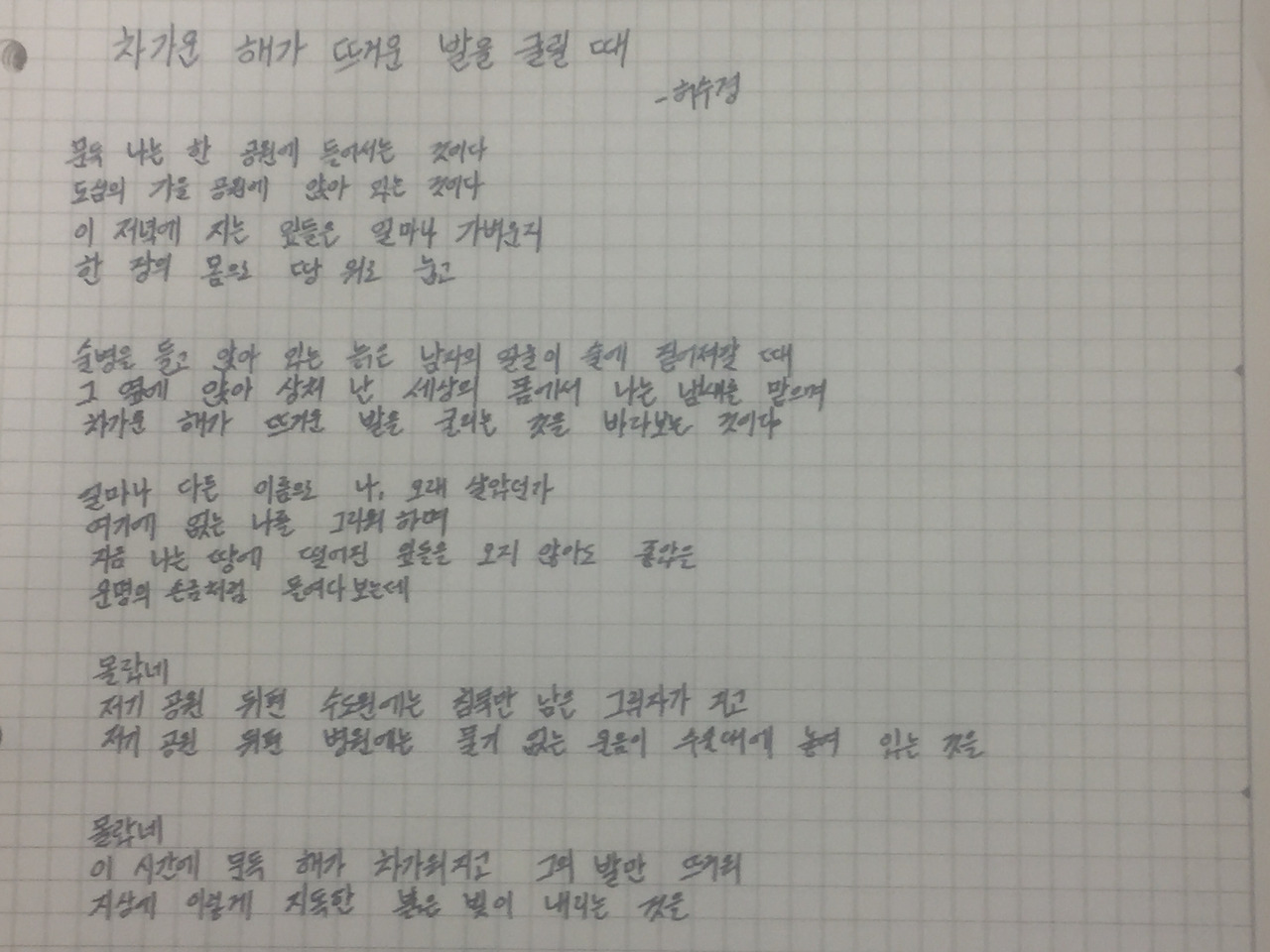 허수경 시인을 이야기하면서 허무를 말하는 분들이 많았습니다. 물론 동의합니다. 나도 그분들의 평론과 해설을 보며 시를 들여보았기 때문입니다. 그러나 다른 결론을 내리고도 싶었습니다. 우리가 그를 보며 관찰한 감정보다는 그가 허무 속에서도 들여다본 감정을 적고 싶었습니다. 욕심이 과해서 다른 시를 사용하기도 했습니다. 무례한 행동이 아니었기를 다만 바랍니다. 부족한 점이 스스로도 보입니다. 더 많이 읽고 써야겠습니다.