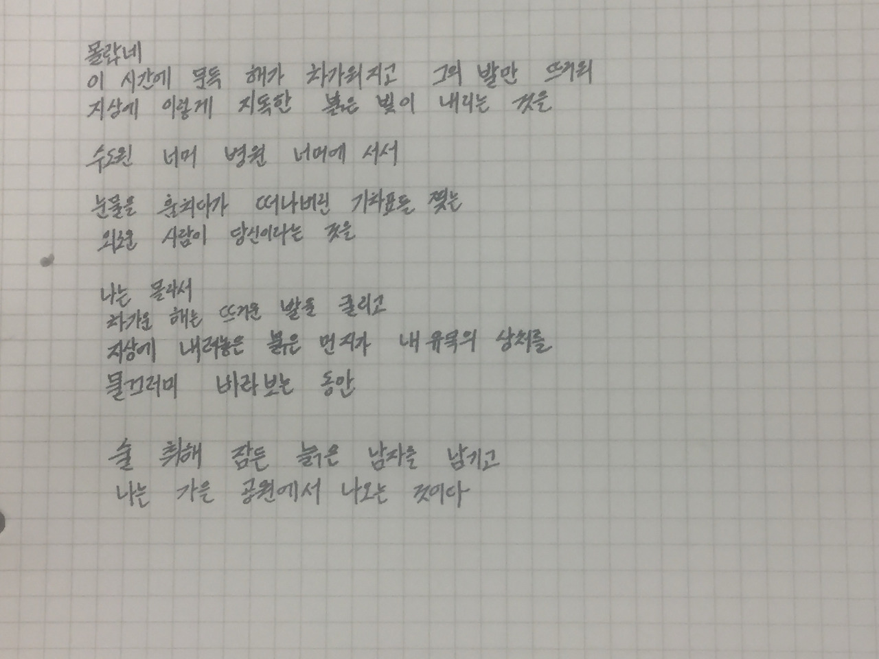 그래서 그는 몰랐다고 거듭 이야기한 것은 아닐까. 그렇지만 이는 회피가 아닌 포옹이다. 내 인생아느 비애라는 분과 더불어 살 수밖에 없을 것 같은데 사실 나는 이 분을 잘 모른다. 그렇지만 껴안고 가야 한다. 설령 그것이 '생을 가르는 검'일 지라도 말이다. 그런 감정의 층위와 시적 소재를 엮어본다면 "잎새에 이는 바람에도 나는 괴로워했다"(윤동주, 『하늘과 바람과 별과 시』, 「서시」) 를 인용하는 것도 비약이 아닐 것이다. 사실, 이 시를 가져온 이유는 그다음 문장 때문이다. "별을 노래하는 마음으로 모든 죽어가는 것을 사랑해야지"다. 이것이 "술 취애 잠든 늙은 남자를 남자를 남기고" "가을 공원에서 나오"며 생각했던 감정일 것이다.