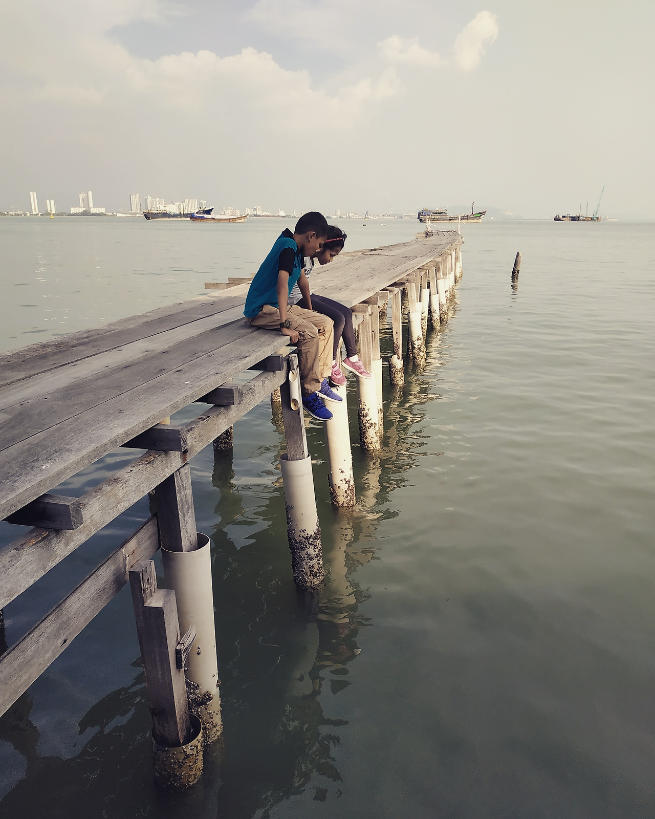 이곳 페낭 츄 제티(Chew jetty)*에서 해가 질 때까지 위에 보이는 나무다리에 걸터앉아 있던 중이었다. 한 소녀와 소년이 옆으로 오더니 나와 친구들을 신기한 듯 바라보았다. 아마 우리에 대해서 말도 주고받고 웃기도 하더니 내가 "둘이 커플이에요?"라고 물어보니 부끄러운지 얼굴이 빨개지며 등을 돌리며 멀찍이 가서 걸터앉고서 한참이 지난 후에야 "우린 오누이예요"라고 소년이 답을 해주었다. 오누이는 한동안 바다를 바라보았다. 바닷속에서는 이리저리 물고기들이 헤엄치고 있었고 소녀는 신기한 듯 바라보며 이것저것 오빠에게 물었다. 그리고 우리와 눈을 마주칠 때마다 미소를 지어주다가도 휙 고개를 돌렸다.