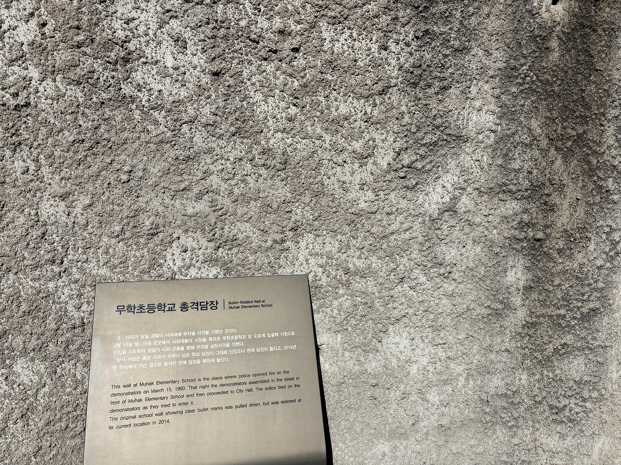 3.15 의거 당일 부정선거에 항거하며 무학초등학교 앞 도로에서 시청으로 진격하던 시위대에게 경찰은 무차별 실탄 사격을 가하여 무학초등학교 앞 담장에 수많은 총탄자국이 남았다. 실제 총탄의 흔적이 남아있던 원래 담장은 헐리고, 2014년 원 위치에서 약간 옆으로 옮겨진 곳에 담장을 복원했다고 한다.