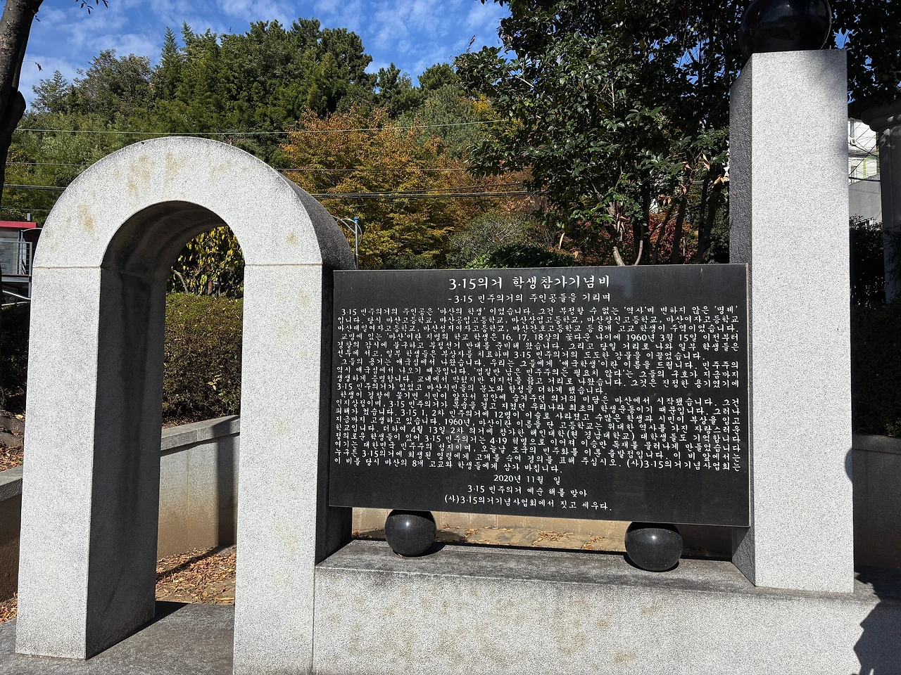 남성동파출소와 마산시청 중간 지점인 3.15 의거 기념탑은 3.15 부정선거에 항거한 날을 기념하고 3.15 의거에서 희생된 시민들의 넋을 위로, 그 정신을 계승하기 위해 1962년 9월 20일에 세워졌다. 탑 앞에는 3.15 의거의 주역이 학생과 시민임을 보여준다. 그 뒤로 조성된 작은 공간의 공원과 비문이 있는데, 관리가 안 된 탓인지 거미줄과 이끼가 끼어 있었다. 그것이 시민들의 인식을 반영하는 것 같아 마음이 아팠다. 노인 한 분이 우두커니 그곳에 앉아 쉬고 계셨다.