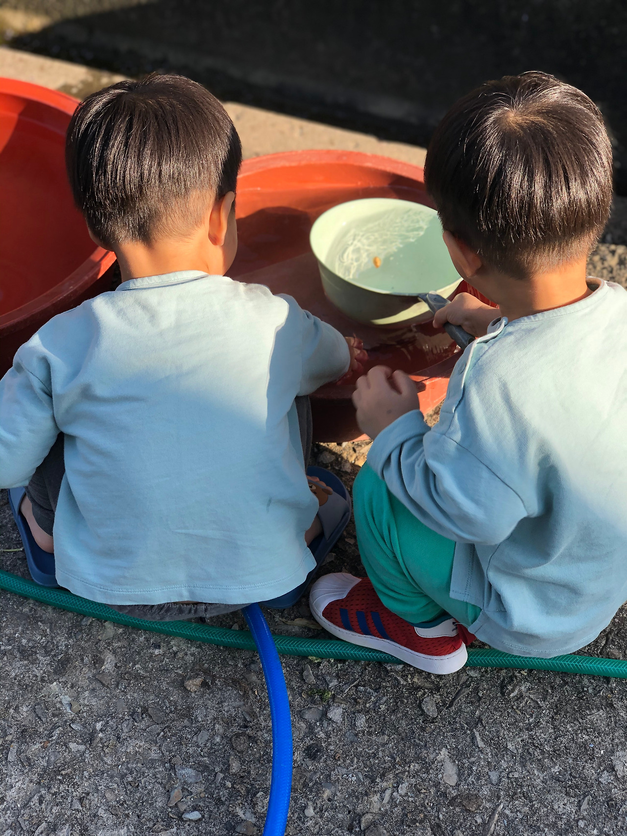 마당 구석에 받아놓은 물에 몸은 못 담가도 두 녀석은 물장난에 심취했다. 갈아입을 옷이 부족하다는 것 따위는 자신들의 걱정이 아니겠지. 아직도 쉬를 제대로 못 가려 이미 새로 갈아입힌 옷인데, 나는 눈에 불을 켜고 녀석들의 저지레를 지켜본다. 뒤통수에 꽂히는 내 시선의 뜨거움을 전혀 모르는 듯한 녀석들. 그저 개구쟁이다. 그래서 더 사랑스러운지도 모르겠다.