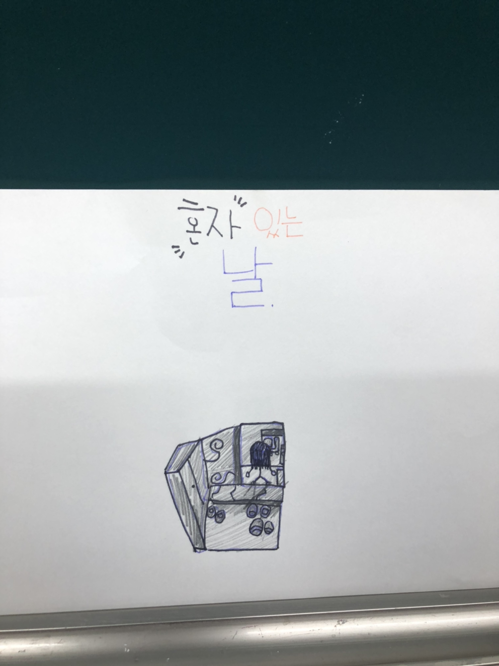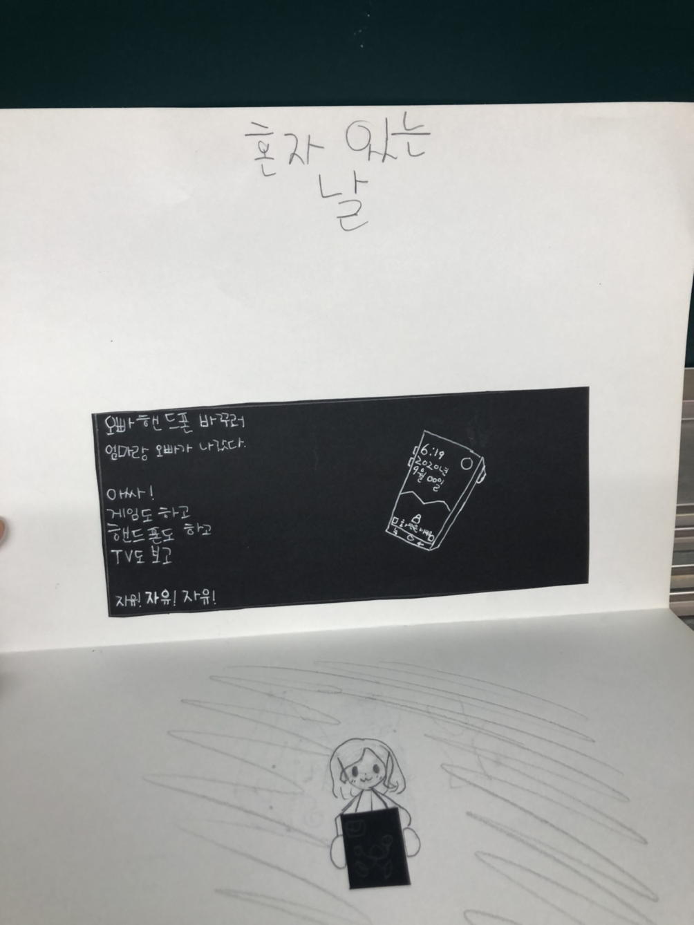 이맘때 아이들은 엄마가 없이 혼자 남겨지면 불안해하거나 힘들어하는데, 자유를 외치다니! 보기에는 여리고 겁 많아 보였던 여학생의 반전에 까륵 넘어갔다. 게다가 도화지의 큰 공간에 많은 여백을 남기고 "혼자"를 강조한 듯한 그림은 매우 인상적이다. 아이들은 내가 "가르쳐서"라기보다, "기회를 주어서" 자신의 재능을 발견한다.