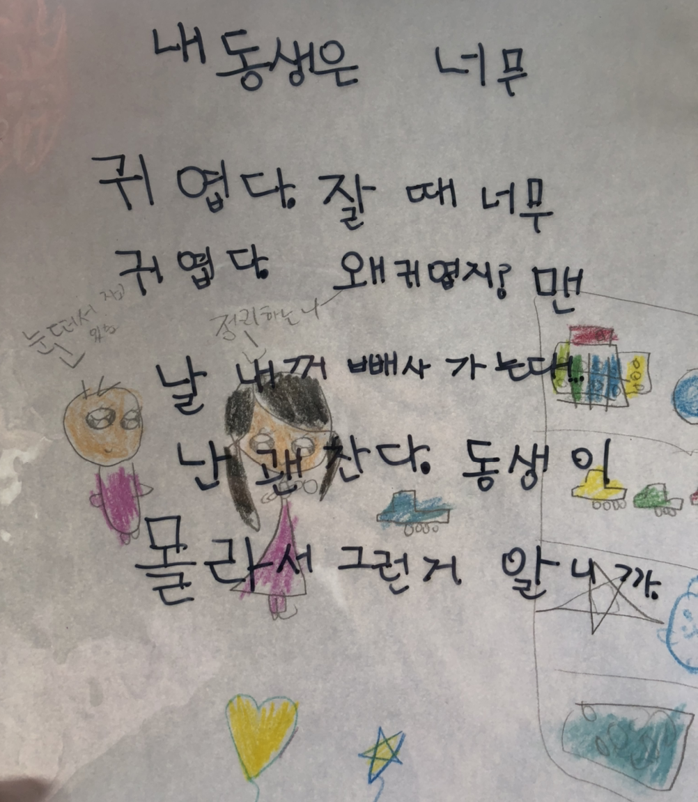 5분 글쓰기 훈련이 반복된 어느 날, 아이들은 조금씩 쓰기 시작했다. 주제에 맞게 말이다. 글씨도 삐뚤빼뚤, 늘 못 하겠다고 징징대는 우리 반 시아(가명)의 첫 시를 공개한다. 7살 차이 나는 동생을 끔찍이 사랑하며, 가끔은 2학년이라고 볼 수 없을 정도로 작고, 여린 시아는 별명이 울보다. 완성한 시를 보고 칭찬을 잔뜩 했다. 틀린 글씨도 고치고 행과 연을 정리해 주었다. 작품을 다시 한번 멋지게 꾸며보자 했더니 하나도 안 고치고 자기가 쓴 그대로 다시 옮겨 써 왔다. 그러고도 으쓱한다. 시를 잘 썼다고 칭찬받은 첫 경험이 너무 기뻤나 보다. 귀엽다.