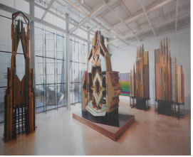 여기서 지적하고 싶은 부분은 이렇게 만들어진 건축적 풍경이 보여주고 있는 것이 무엇인가 하는 지점이다. 부분을 이루고 있는 것들은 전부 중국 더 자세히 말하면 베이징에서, 크게 잡아서 말하면 아시아에서 온 것이지만, 일종의 현대화 된 건축적 소재들이다. 이때 현대화라고 하는 것은 무엇을 의미하는가. 현대화 혹은 근대화라는 것이 서구를 따라가는 것, 따라가서 서구의 현대라는 시간을 따라잡는 것을 의미하던 때에 현대화는 ‘서구처럼 되는 것’을 의미했다. 그러나 결국 우리는 서구가 될 수 없고 이러한 의미에서의 현대화는 결국 허상에 불과하다. 그렇다면 ‘현대’를 무엇이라고 새롭게 정의 내려야 할 것인가. 작가는 이러한 소재들을 가지고 어떠한 풍경을 그려내는데 각각 개별의 조각들이 내 눈에는, 고딕 형식의 성당, 오래된 유럽 중세의 성처럼 보였다. 그렇게 생각했더니 이 공간은 유럽 중세의 장원과 같은 공간으로 변했다. 고딕 형식의 성당이나 유럽의 고성의 이미지는 실제 그곳에 한 번도 살아본 적이 없는 우리들의 머릿속에서도 거대한 성당과 성을 떠올리면 가장 먼저 떠올리게 되는 이미지라고 할 수 있다. 여기서 작가의 작품 자체가 제작되는 과정과 그리하여 작가가 제시하고 있는 이미지들 자체에 대한 논의를 서로 나눠서 해볼 필요가 있다.