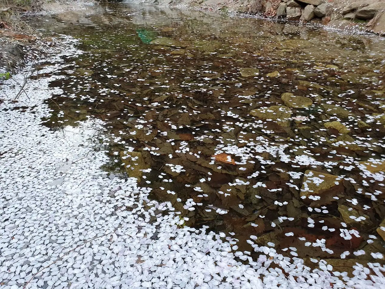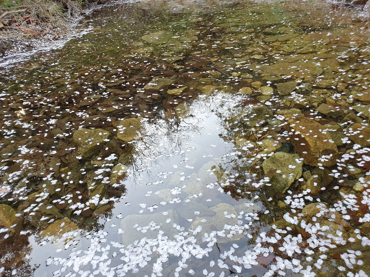 그제 내린 봄비로 인해서 둘레길 흙이 살짝 젖어있다. 이제는 파릇파릇 나무들이 옷을 입고 관악산을 가리고 있다. 마치 겨우내 벌거벗은 산을 나무들이 잎사귀로 옷을 입힌것 같다. 봄비로 떨어진 벗꽃의 잎사귀가 시냇물이 고여있는 곳을 아름답게 수놓고 있다. 마지 한폭의 그림처럼 벗꽃잎이 물위를 덥고 물에 반사되어 비쳐지는 풍경과 아름답게 조화를 이룬다. 이 모든 주변의 것들이 아름다움으로 보여진다.