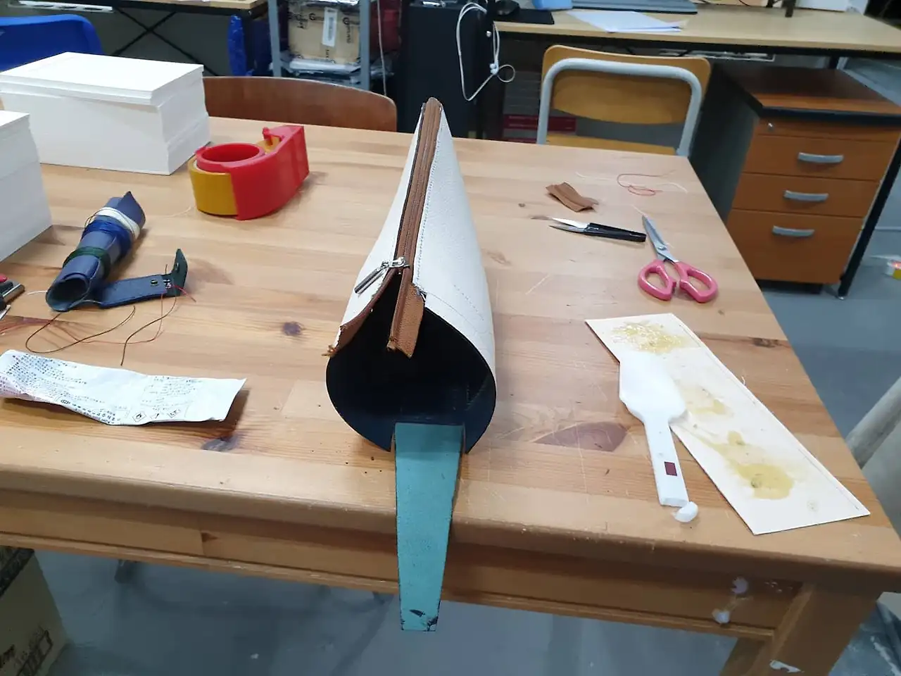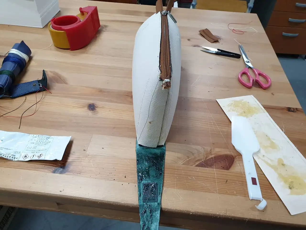 ㆍ도전은 아름답다 ㅡㅡㅡㅡㅡㅡㅡㅡㅡㅡ☆ 손 가방 파우치를 만들어봣다. 그동안 열심히 배운걸로 뭐라도 만들고 싶었다. 그래서 누군가 가지고 다닐만한 손가방을 만들어보자고 마음먹고 시작을 했다. 두꺼운 종이로 패턴을 뜨고 가죽을 패턴에 맞게 잘랐다. 그리고 바느질을 하는데 당초 생각했던 대로 잘 되지 않았다. 그리고 자꾸만 욕심이 생겨 다른걸 넣게된다. 그래서 당초 생각했던 것보다 더 많은게 들어갔다. 깔끔하게 아이보리 한 색상으로 하자고 마음 먹었는데 너무 단순하다고 생각되어 녹색을 넣었고 또 안에 수납이 부족한거 같아 수납공간을 넣다보니 배불뚝이가 되어 버렸다.