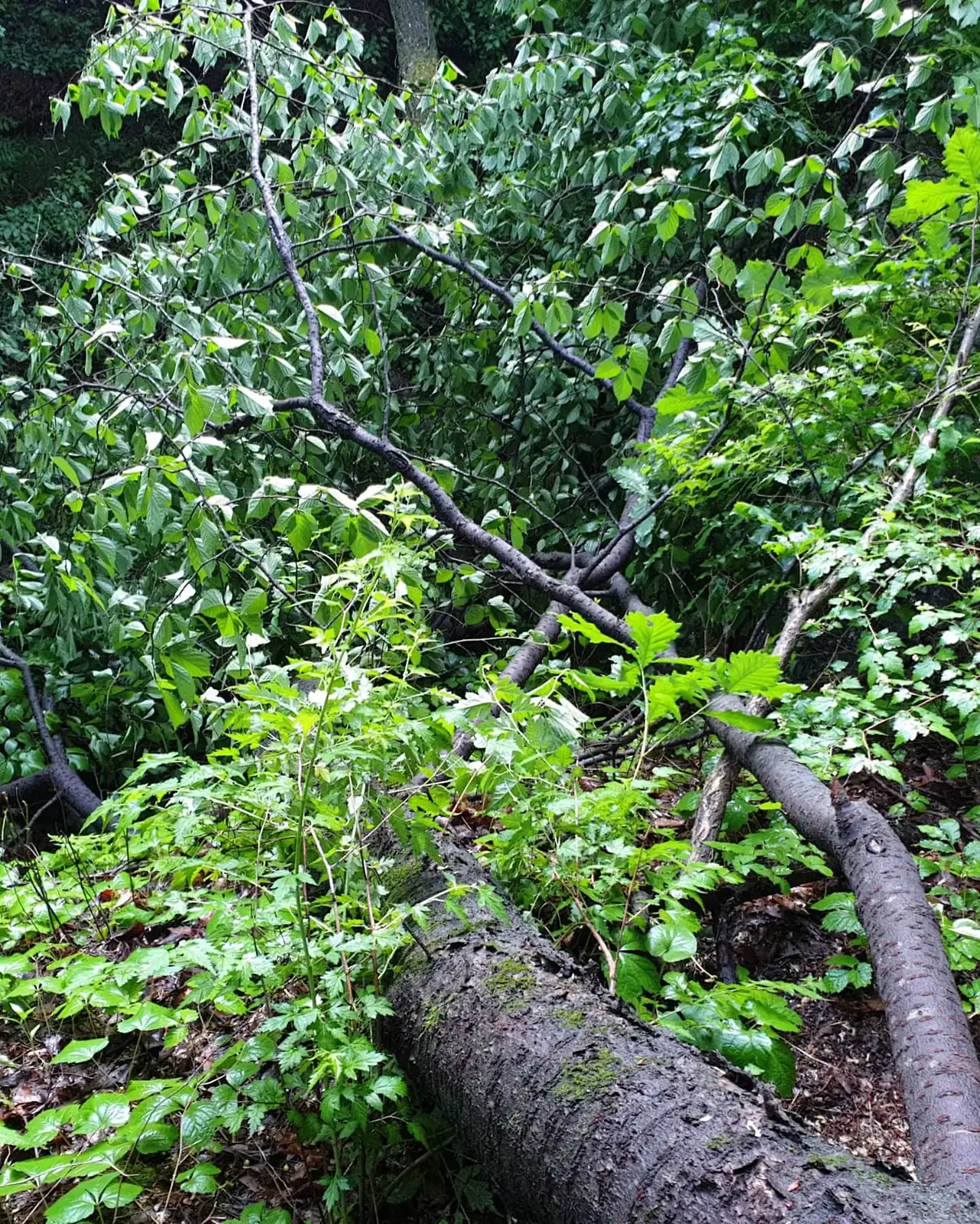열심히 가다보니 지난 비에 비스듬히 자라고 있던 고목이 스스로의 무개를 못견뎌 부러져있다. 그 밑을 지나다니면서 건강하기만을 빌었는데 지난주말 장맛비처럼 내렸던 비에 나무가 젖고 무겁다보니 스스로 견디지 못하고 부러졌구나 싶다.