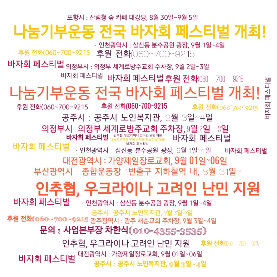□ 사단법인 인간성회복운동추진협의회(인추협, 이사장 고진광)와 사단법인나눔국민운동본부(대표 손봉호)에서는 추석을 맞이하여 나눔기부운동 바자회 페스티벌 행사를 진행한다.