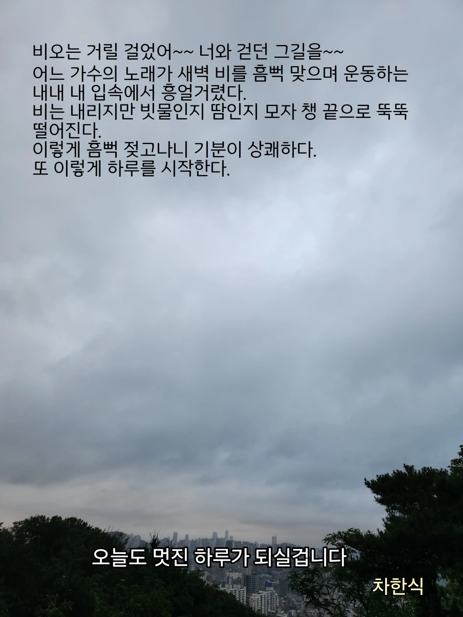 새벽 5시 10분 주섬주섬 옷을 갈아입고 밖에 나가니 빗줄기가 가늘게 내린다.