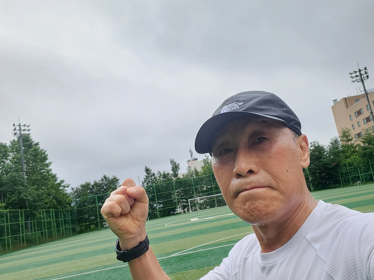 10바퀴를 열심히 돌고 인증사진을 찍고나니 모자 창을 타고 땀인지 빗물인지 뚝뚝떨어진다.