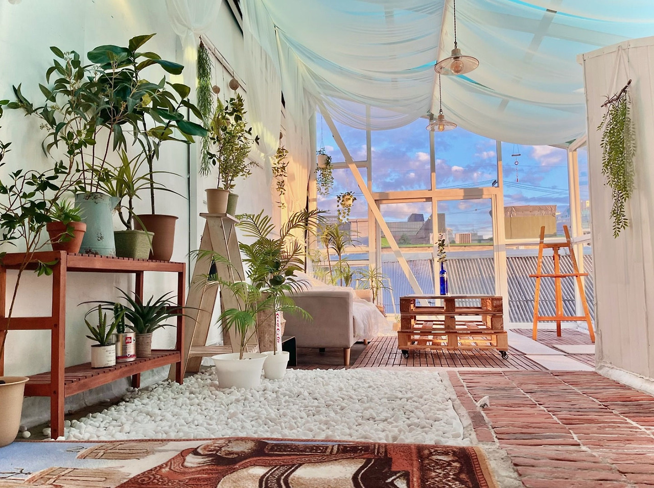 하얀 창틀이 공간에 깨끗함을 더한다. 집의 잉여 공간에서 지붕이 있으면 발코니라고 하고, 지붕이 없으면 테라스라고 하는데, 같은 발코니라도 이 공간은 지붕이 유리로 되어 있어 개방감과 함께 마치 야외에 있는 듯한 청량감을 준다. 하늘빛이 그대로 보이는 투명한 유리 지붕 아래에 천막처럼 여유롭게 늘어진 하얀색 시스루천이 공간에 곡선을 더한다. 건축할 때 쓰이는 재료들은 보통 직선이다. 벽돌도, 철근도, 벽의 마감도 곡선으로 하기보다는 직선으로 설계한다, 이는 설계와 시공상의 편의성 때문이기도 하고, 직선적이고 딱 떨어지는 예측 가능한 공간에서 인간이 느끼는 안정감 때문이기도 하다. 그러나 직선만으로 이루어진 공간은 움직이지 않는 그네처럼 재미가 없다. 앞 뒤로 흔들리지 않는 그네는 안정적이겠지만 그네로서 충분한 역할을 해내지 못하는 것처럼 직선만으로 이루어진 공간은 쉼과 안식이 있는 공간으로서 적절하지 않다. 그런 의미에서 지붕을 감싸듯 유연하게 떨어지는 천정의 커튼이 공간 전체를 안아주는 듯 포근하게 한다. 한낮의 강렬한 태양빛을 막아주는 것은 덤이다.