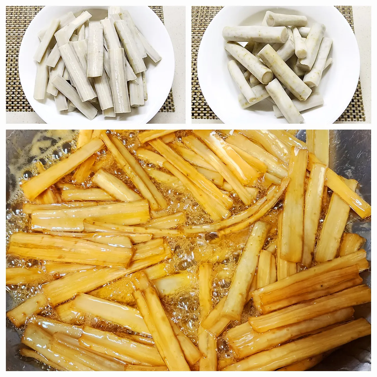 우엉에 국물 위의 사진처럼 줄어들 때 꿀 1스푼을 넣고 국물이 줄어들 때까지 볶아냅니다.