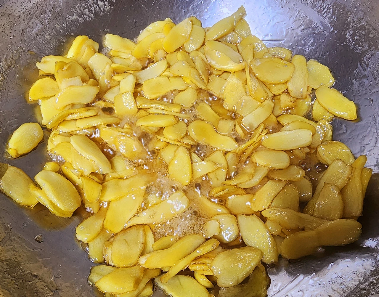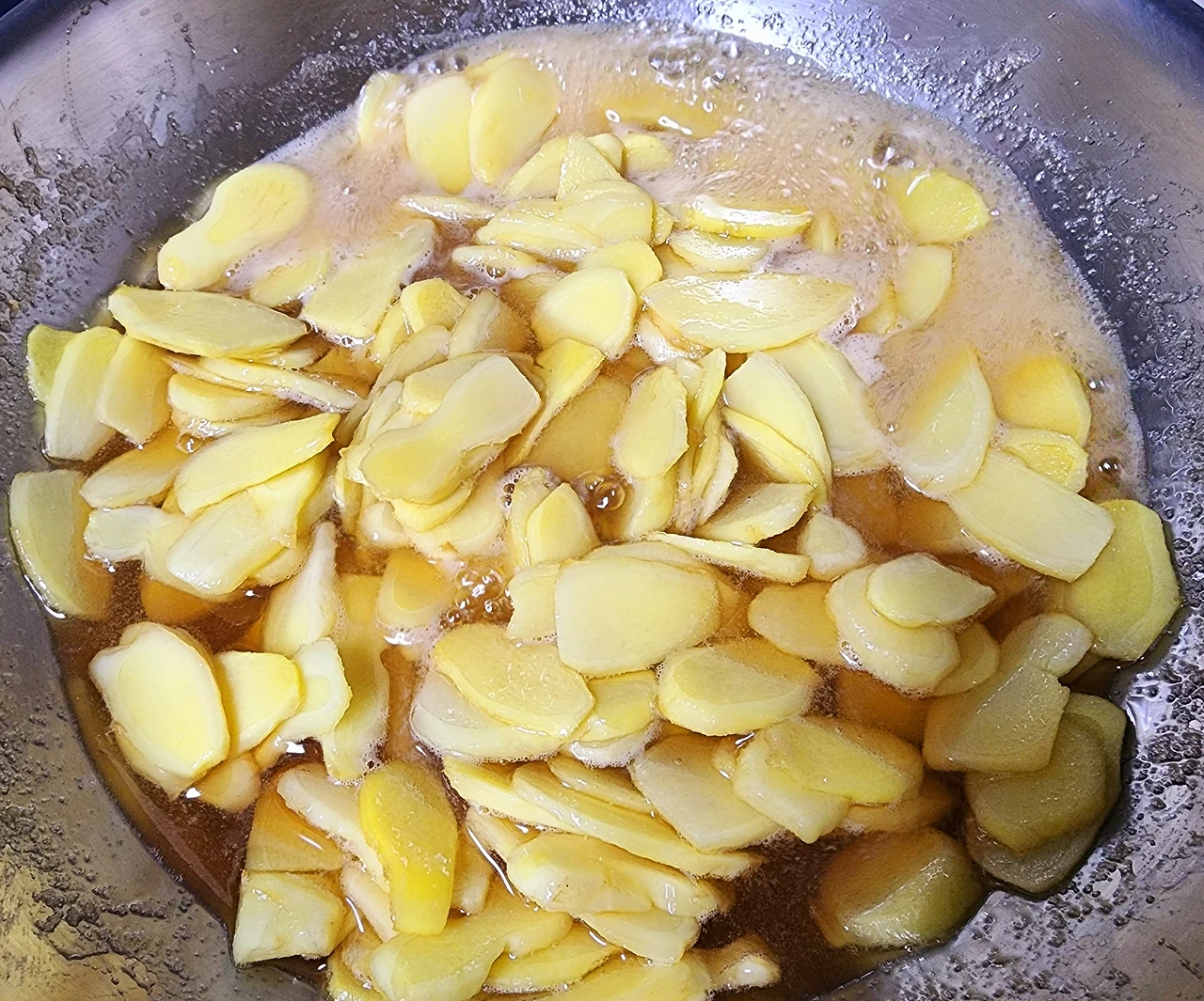 슬라이스로 예쁘게 썰어놓은 생강은 큰 웍에 넣어서