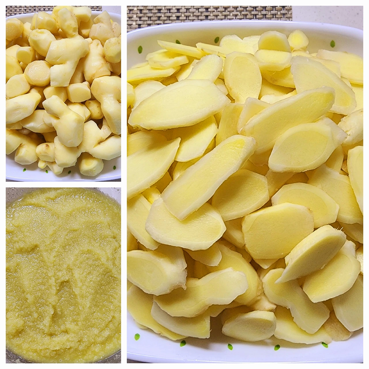 슬라이스로 예쁜 모양은 편강을 만들고 자투리는 모양은 믹서기에 갈아서 설탕을 넣고 생강청을