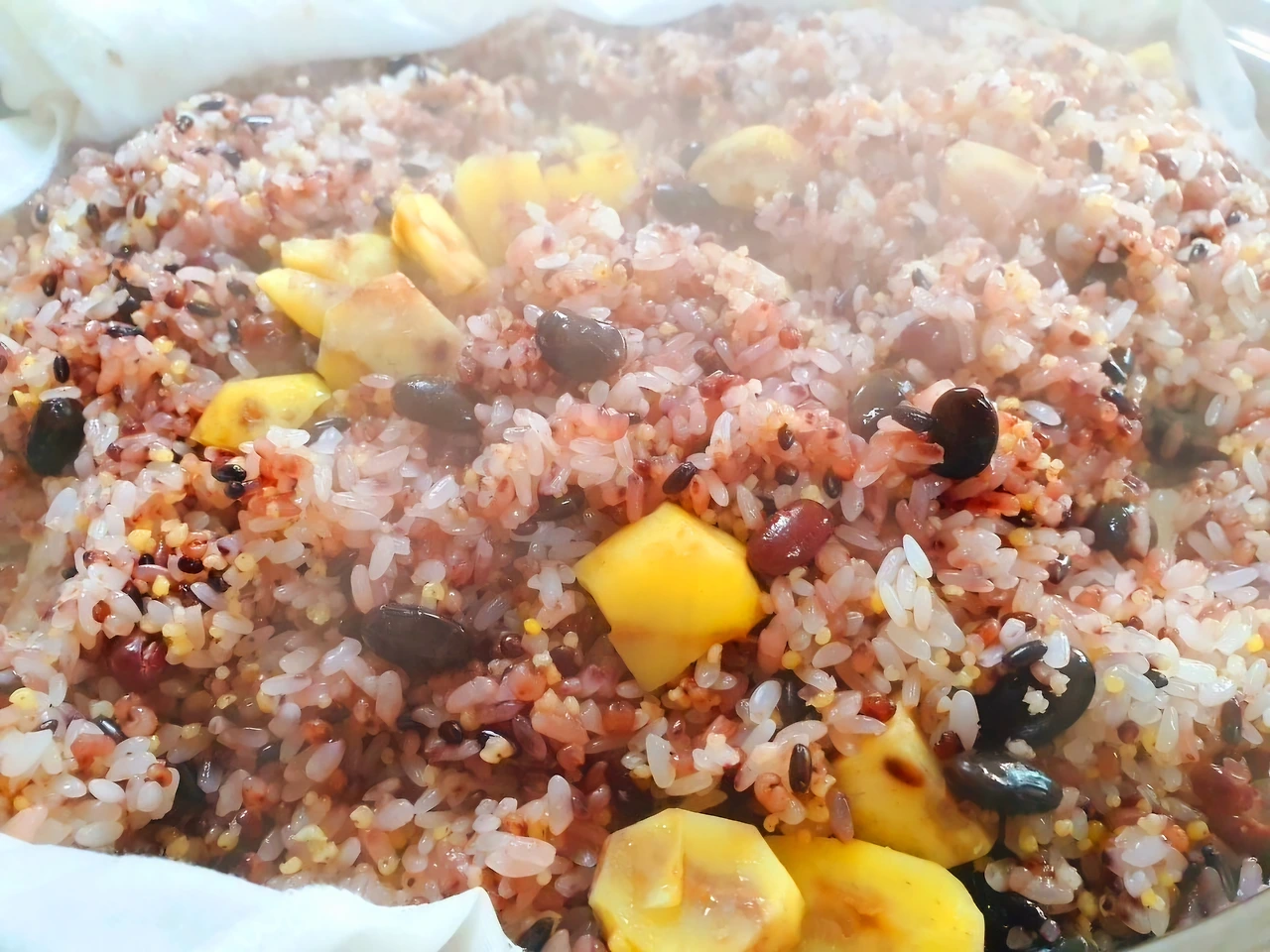 넓은 찜기에 면포를 깔고 내용물을 넣고 강불에서 20분간 쪄줍니다. 강불에서 20분 정도 지나고 오곡찰밥 재료에 생수 1컵을 골고루 뿌려줍니다. 그래야 설익지 않습니다. 그리고 주걱으로 골고루 뒤집어줍니다.
