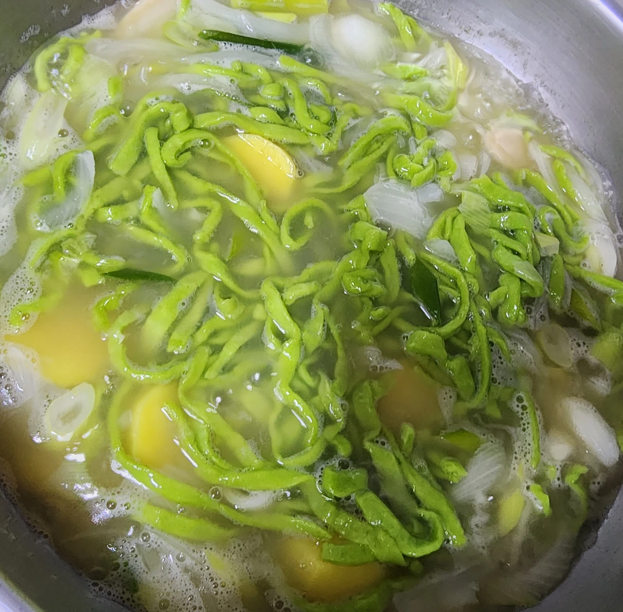 육수를 미리 만들어 놓은 국물에 감자 3개를 반으로 잘라서 넣고, 양파, 파, 청양고추, 호박을 넉넉히 썰어 넣는다 맛의 풍미를 더하기 위해서 차돌박이를 적당히 넣는다 국간장, 참치액, 소금으로 조금씩 넣어가며 간을 맞춘다부추와 양파를 갈아서 반죽을 해서, 눈으로 보기에도 맛있어 보이지만 사실 엄마 따라서 칼국수 해 먹는 그 맛이 괜찮다 건강하게 밀가루 음식을 먹을 수 있다고스스로 위안을 하고, 내가 직접 만들었다는 왠지 모를 뿌듯함이 있다