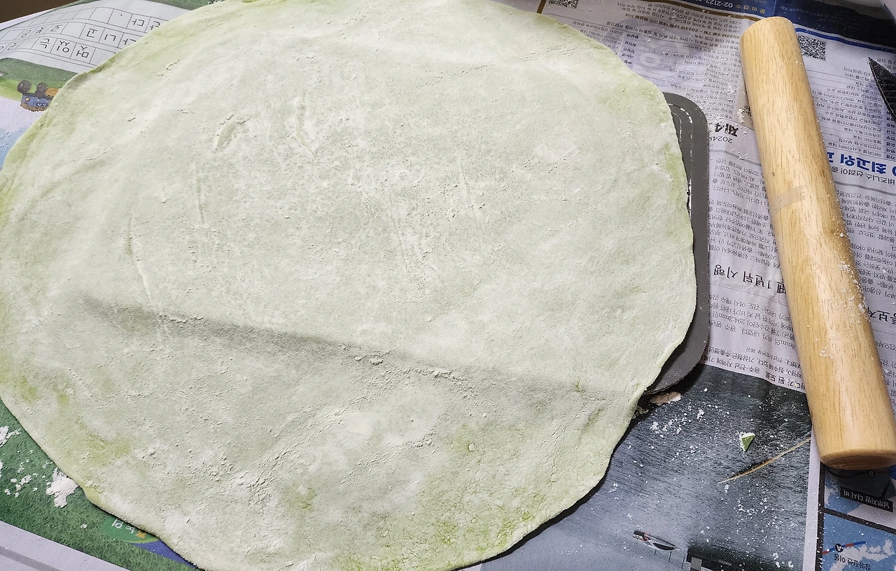 칼국수 국물에 들어갈 육수를 만들어 놓고, 밀가루 반죽을 하는 데는 나만의 방식으로 한다 양파와 부추를 믹서기에 갈아서 그것으로 밀가루 반죽을 한다 반죽 색깔이 푸른 자연을 머금고 있어서 색깔이 너무 예쁘다 너무 되지도 않고 너무 질어지지 않게 반죽하는 것이 포인트다 홍두깨로 잘 밀릴 정도의 반죽이 나름 기술인 것이다 반죽이 됐으면 비닐에 싸서 20분 정도 냉장고에 숙성시킨다 냉장고에 두었다가 사용하면 점성이 더해져서 더 짤지고 쫀득해서 국수가 잘 밀린다그리고 쫄깃한 맛도 더 있다 신문을 넓게 깔아 두고 그 위에 얇은 플라스틱 도마를 두고 국수를 밀면 된다 생각보다 그리 어려운 것이 아니라서 맘만 먹으면 누구나 할 수 있다