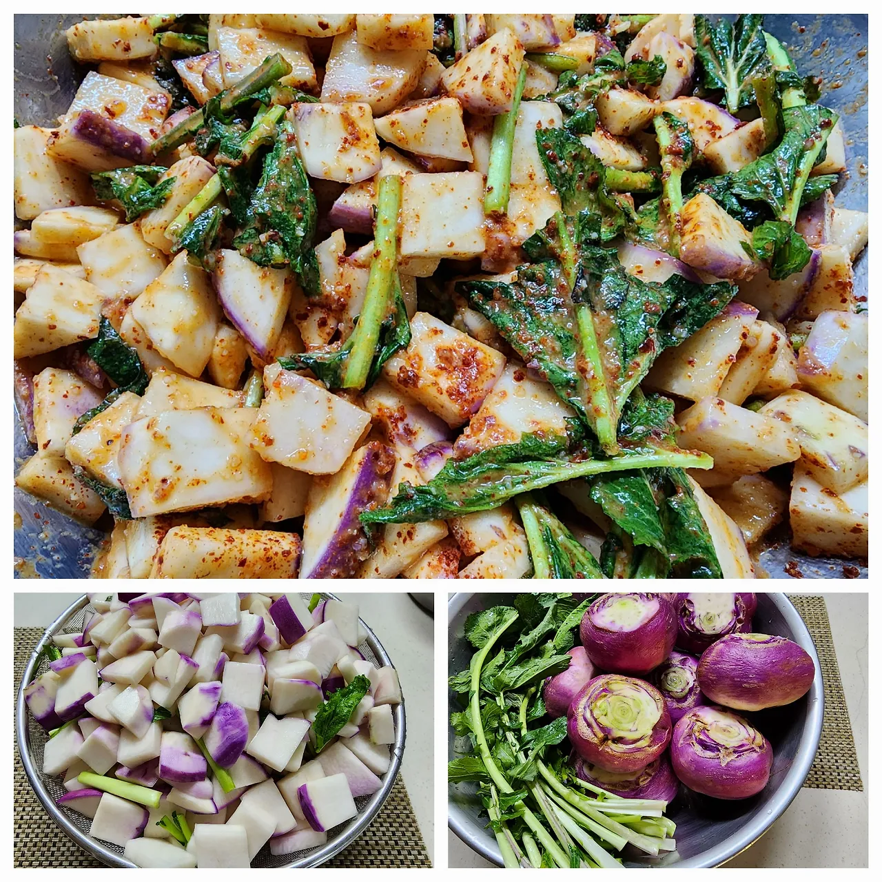 종갓집 종부 엄마가 알려준 포인트는 순무 김치에는 젓갈을 새우젓으로 간을 해야 그 맑은 순무의 맛이 그대로 살아있다 고춧가루를 너무 많이 넣으면 안 된다는 것, 간을 쌔게 하지 않아도 되는 것은 '순무 본래의 맑은 무 맛을 시원하게 먹어야 제맛'이라는 것이다 달달하고 부드러운 맛, 순무 김치는 일반무로 담는 깍두기와는 또 다른 맛이다 순무 김치는 부드럽게 씹히는 맛이 일품이라서자꾸 당기는 맛이다