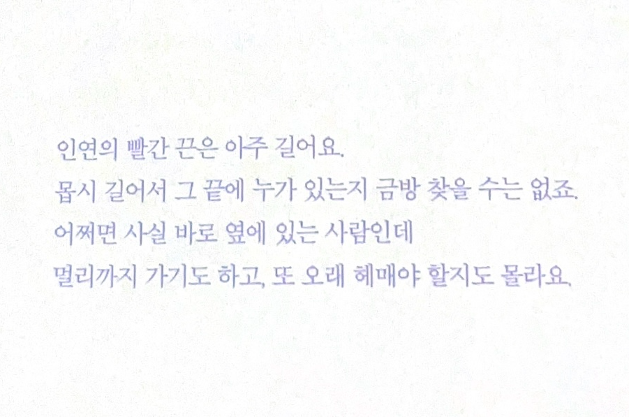 우리의 이별엔 헤어짐이 없었다. 이별이라 말해도 아무것도 끝나지 않았다. 예전의 나는 이별하면 남자친구의 사진을 보이는 대로 삭제했지만 그의 사진은 한 장도 지우질 못 했다. 그가 나를 떠났을 땐 아픈 문장이 되었고, 화해를 요청한 뒤엔 먹먹한 문장이 되었으며, 서로의 깊은 마음을 확인했을 땐 풍성한 문장이 되었다. 마음의 온도가 차오르는 동안 우리는 그 자리를 맴돌고 있었기에 다시 마주하는 건 실은 너무도 자연스러운 일이었다.