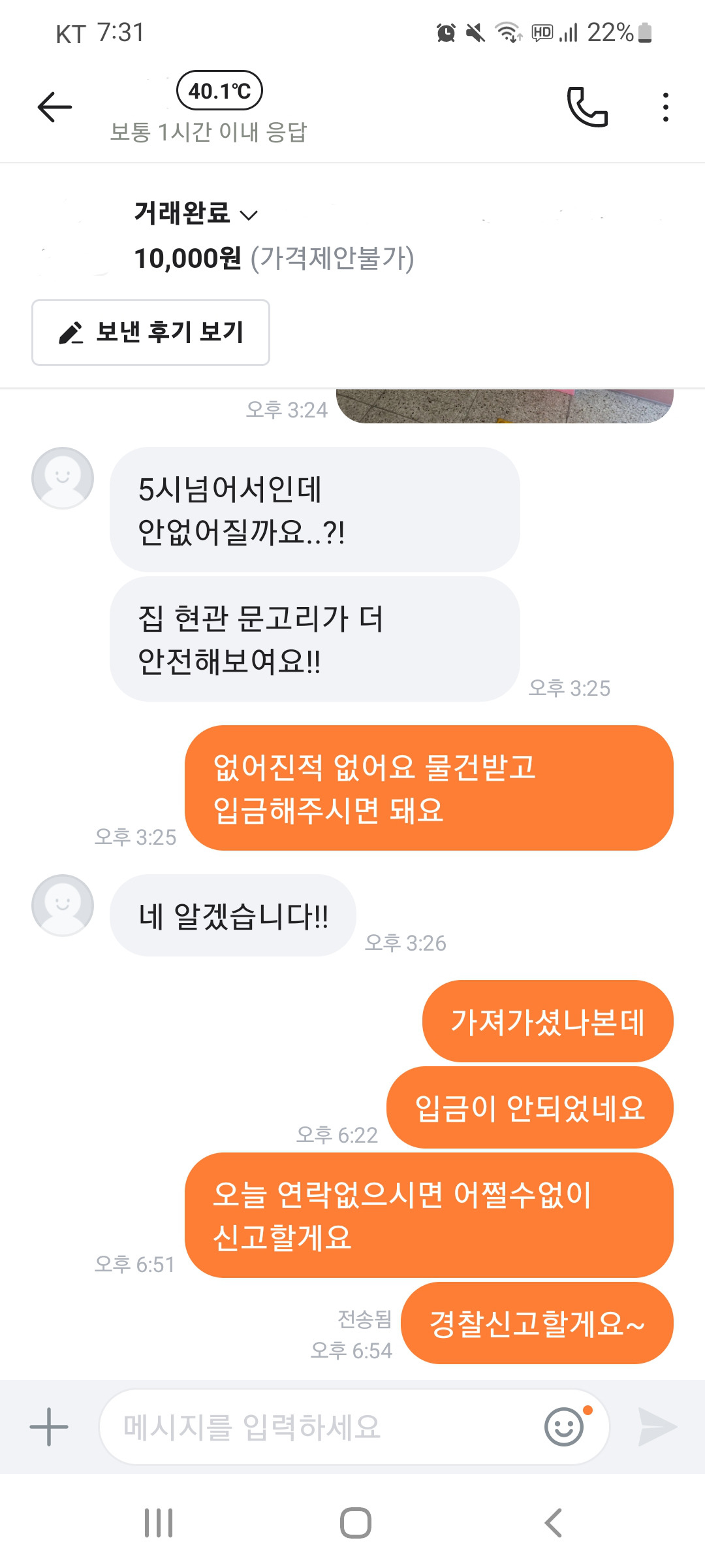 "그러게 처음부터 느낌이 이상하면 거래하지 말아야 하나 봐. 아니면 직접 얼굴을 보고 거래하던가. 선입금받는 거지. 일단 신고하겠다고 메시지 보내."