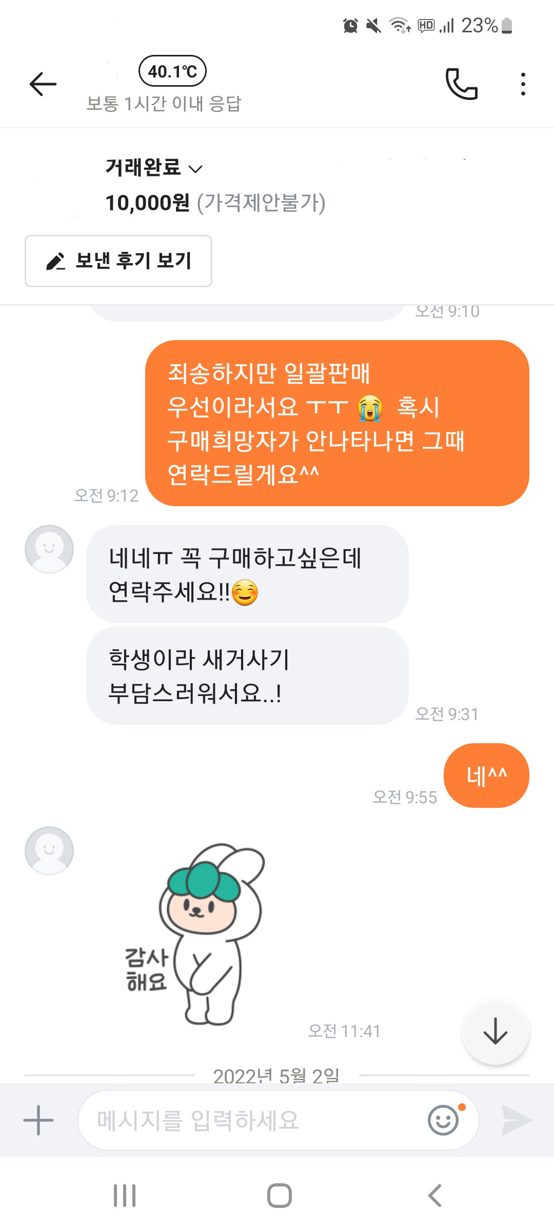 하지만 내 물건에는 하트가 여러 개 찍혀 있었고 분명히 곧 일괄로 물건을 사려는 다른 누군가가 채팅을 걸게 분명했다. 그래서 일단 거래를 거절했다.
