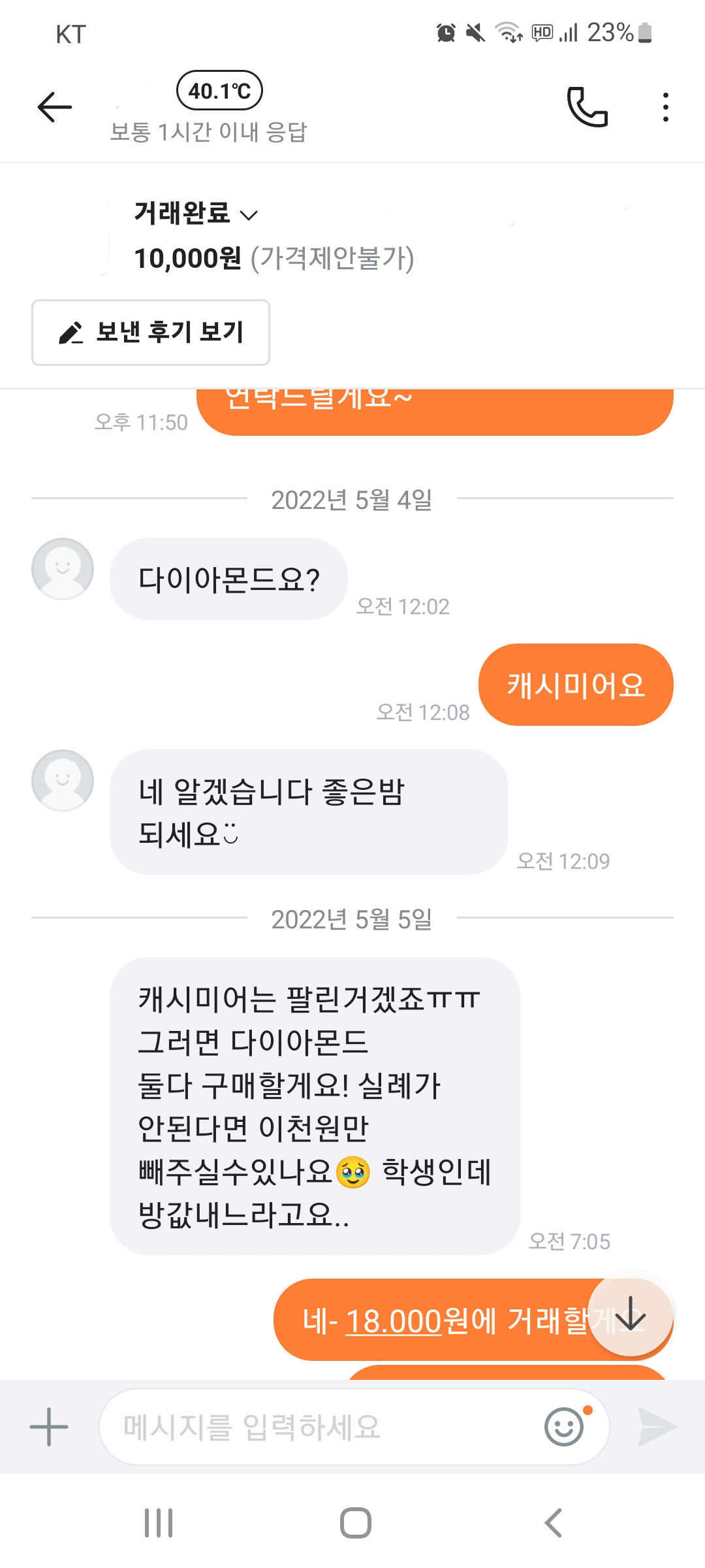 채팅을 건 사람은 캐시미어**세트 중 한 개와 다이아몬드** 제품 중 하나를 구입하고 싶다고 했다. 학생이라 새것을 사기 부담스럽다고 하는 걸 보니 대학생인 모양이었다.