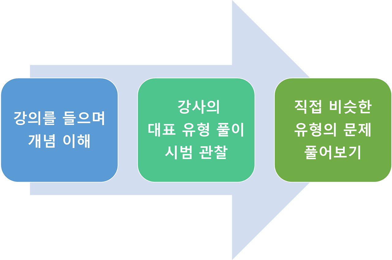 구체적으로 강사의 강의를 들으며 개념을 이해하고, 강사가 직접 대표 유형 문제를 풀어주면 그 방법을 자세히 관찰했다가, 직접 비슷한 유형의 문제를 풀어보는 식으로 반복됩니다. 이 방법은 거의 모든 보습학원에서 통용되는 방식입니다.