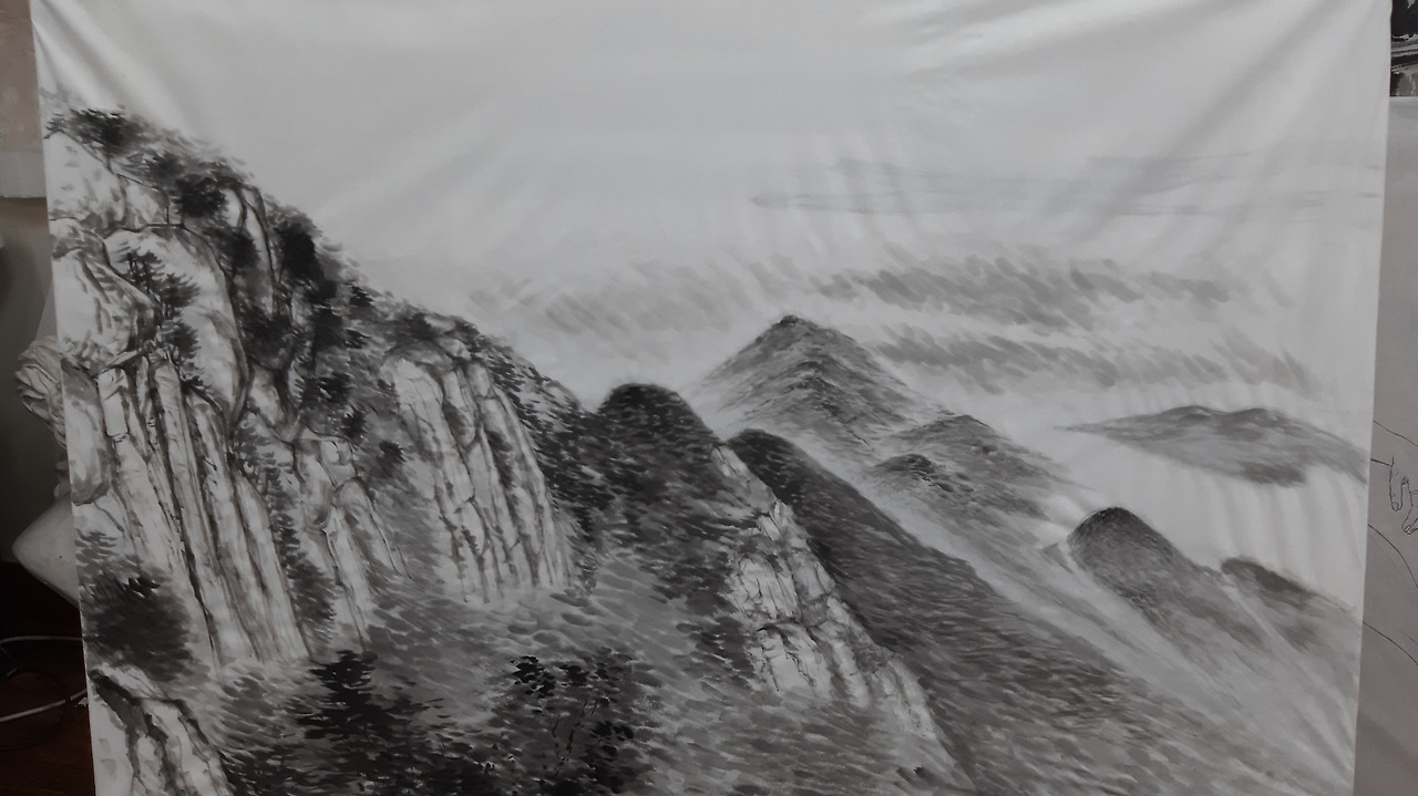 아아, 복잡하다. 먹 하나로 튀어나온 부분, 멀리 있는 부분, 흐릿 흐릿한 부분, 쑥 들어간 부분 등을 표현하려니 막막하다. 정해진 규칙도 없다. 서양화에서는 색채원근법, 공기원근법과 같이 정해진 틀이 있는데 동양화는 그러한 규칙이 없다. 그래서 나처럼 집요하게 분석해서 그리는 스타일의 사람에게 동양화는 정말로 어렵게 느껴진다.