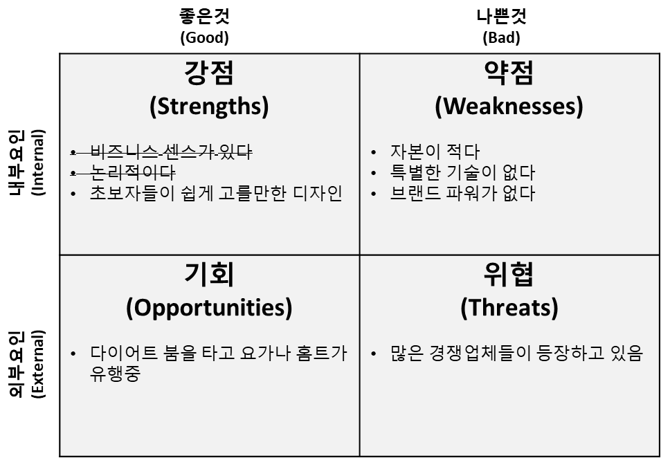 “자, 네가 생각해 본 걸 스왓으로 정리하면 이렇게 되겠지. 그런데 결론이 뭐야? 넌 이미 취업준비하는 거보다 창업하기로 결심한 거잖아. 자본도 기술도 없는데. 결론 난 얘기 다시 해서 뭐해? 그냥 빼버려야지.”