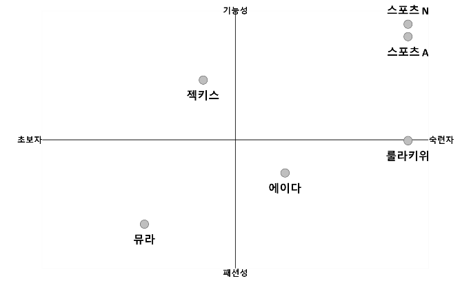 “그래. 완벽한 미씨까지는 바라지 않는다 해도, 너의 맵핑이 직선 형태가 되면 너의 기준 축 중 하나는 별 의미가 없다는 이야기야. 네가 그린 것 중 왼쪽의 프리미엄, 숙련자 기준의 맵은 사실 양대 스포츠사를 제외하면 거의 완벽하게 대각선 일자 형태라고. 간단히 얘기하면 그냥 가격 순인 것이지. 그러면 저런 맵은 있으나마나야.”
