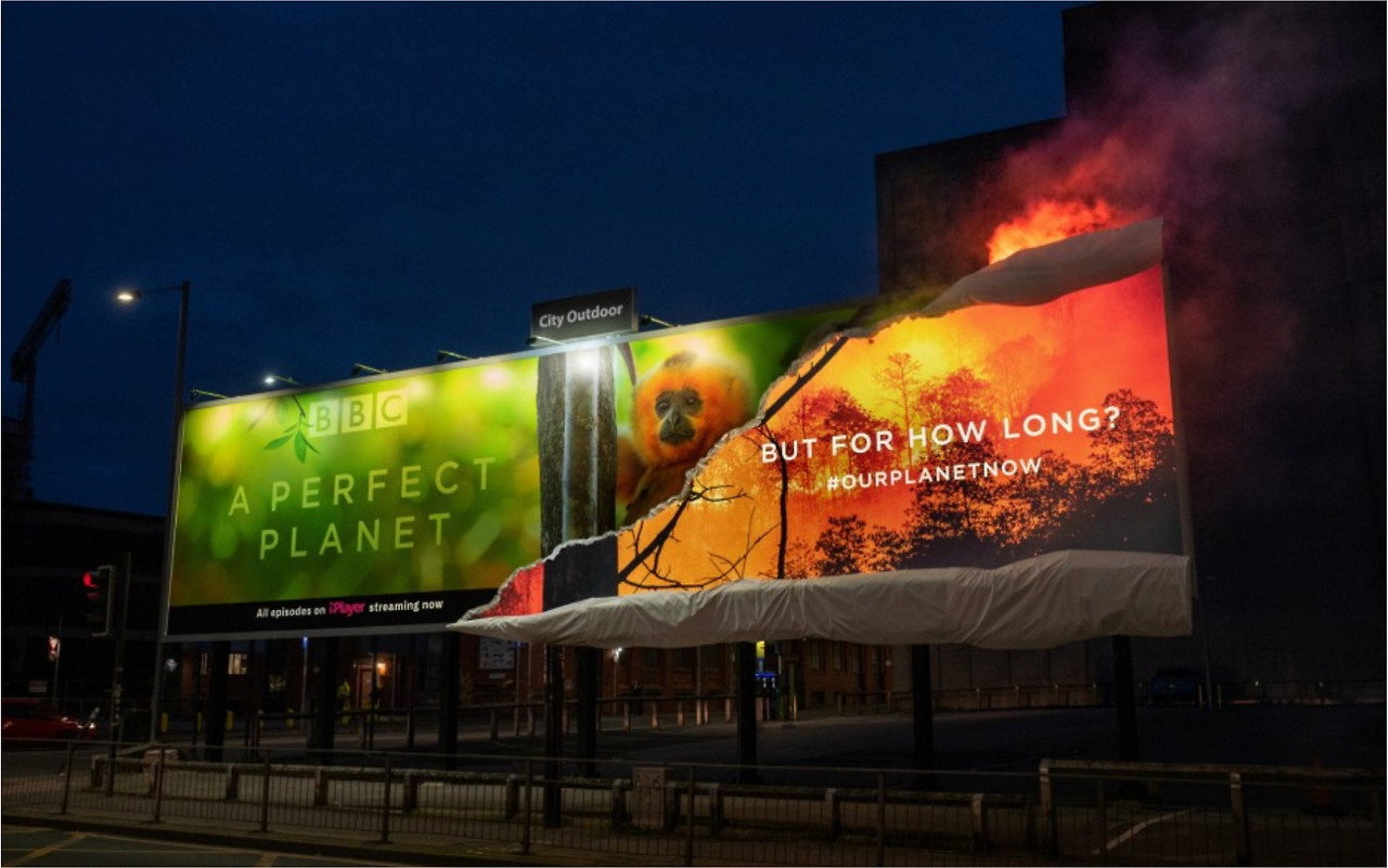 2020년 12월, 영국 BBC 방송국의 새로운 자연 다큐멘터리 시리즈 ‘A Perfect Planet (완벽한 행성)’의 방영을 한 달 앞두고, 영국의 주요 도시 옥외 광고판들이 귀여운 동물들과 아름다운 자연의 풍경으로 채워지기 시작합니다. 연둣빛 정글 속의 쨍한 주황색 원숭이, 에메랄드 빛 바다를 헤엄치는 은색 물고기 떼가 오래된 도시 런던의 곳곳을 환하게 밝혀 주었지요. ‘화산’, ‘태양’, ‘날씨’, ‘바다’ 그리고 ‘인간’의 5편으로 구성된 이 다큐멘터리는 제작진의 오랜 노고가 잘 드러나는 세련되고 훌륭한 영상으로 많은 시청자들의 찬사를 받게 됩니다. 하지만 마지막 에피소드인 ‘인간’의 방영을 앞둔 2021년 1월 어느 날, 이 아름다운 포스터들은 모두 중간이 찢겨 나가게 됩니다. 가장 큰 규모의 옥외 광고판이 설치되었던 맨체스터에는 광고판이 찢겨나간 것뿐만이 아니라 불타오르기까지 했지요. 그리고 찢겨나가고 불타버린 부분에 숨겨져 있던 그림과 메시지가 모습을 드러냅니다. 불타버린 숲, 페트병이 떠다니는 바다와 함께 이제 완성된 진정한 광고의 메시지가 강렬하게 전달됩니다. ‘A Perfect Planet - But For How Long (완벽한 행성 - 하지만 언제까지 완벽할 수 있을까).’ 이 다큐멘터리의 대미를 장식하는 마지막 에피소드 ‘인간’은 지금까지 보여준 이 훌륭한 지구가 인간의 손에 얼마나 쉽게 망가질 수 있는지를 보여주며 환경을 지키기 위한 행동을 지금 바로 시작해야 한다고 경고합니다. 이러한 메시지를 완벽하게 광고판으로 옮겨, 다큐멘터리를 광고하는 것뿐만 아니라 다큐멘터리가 전달하고 싶었던 주제까지 대중들에게 강렬하게 전달하는 데 성공하였지요. 2021년 가장 인상적인 광고 중 하나로 많은 곳에 소개된 것은 당연한 결과입니다.