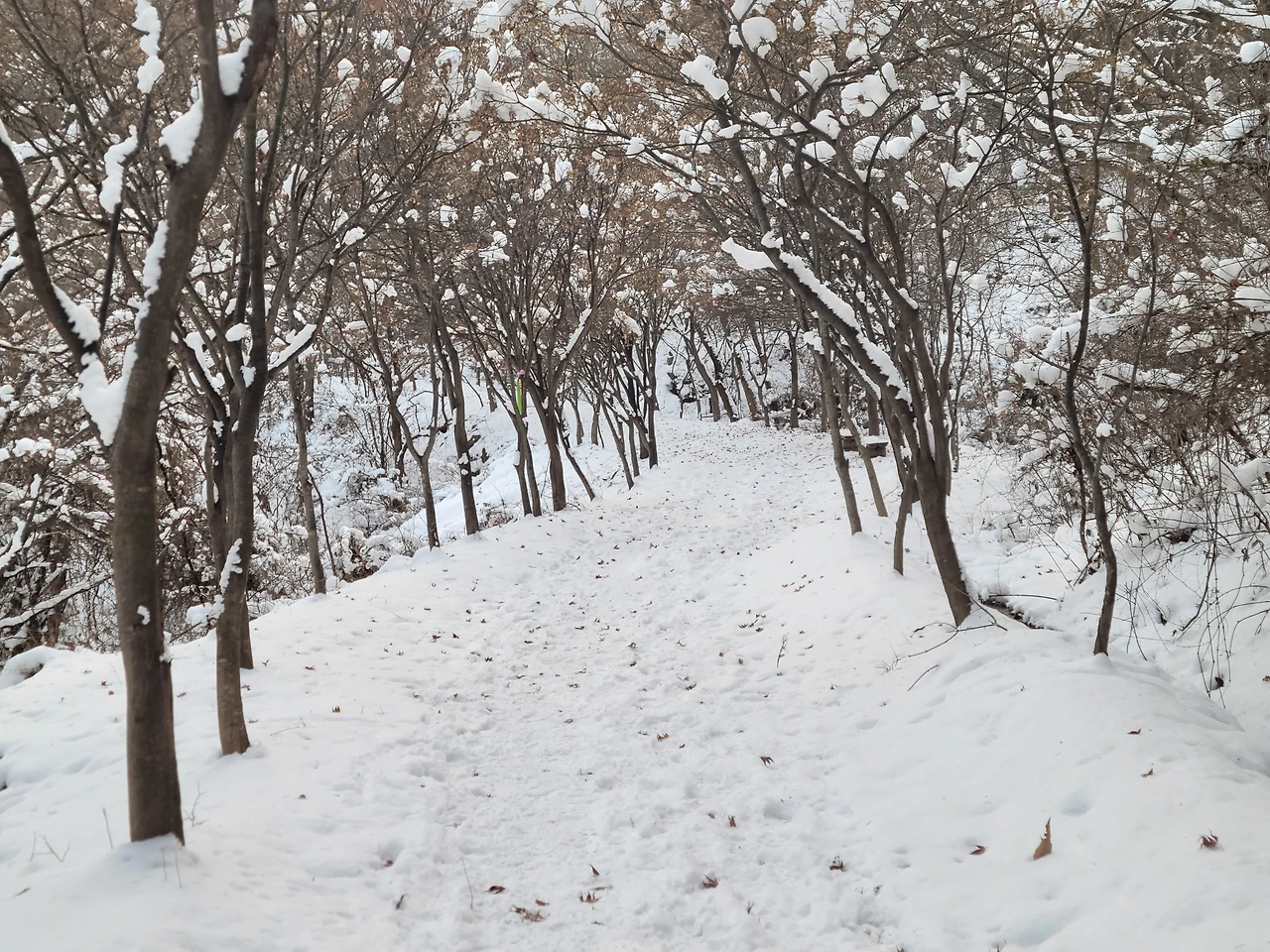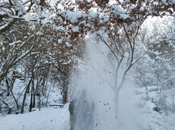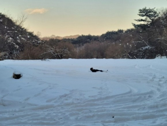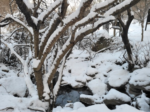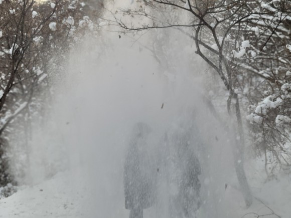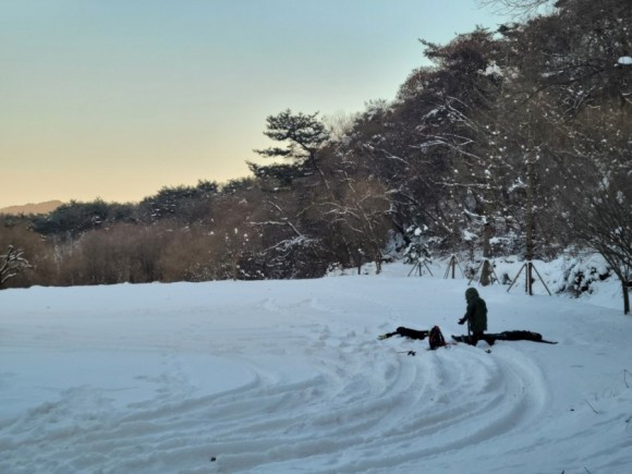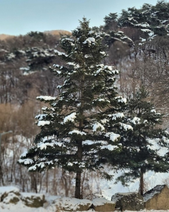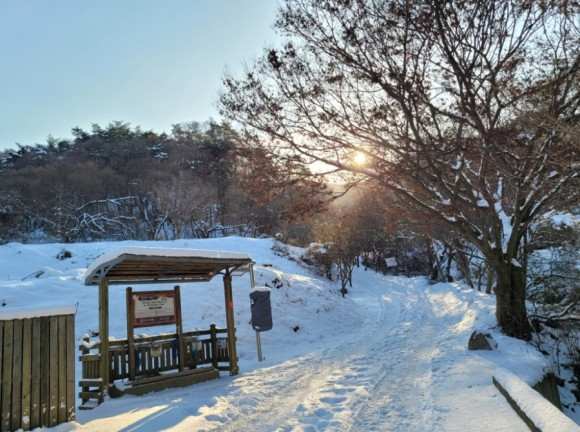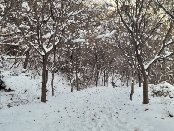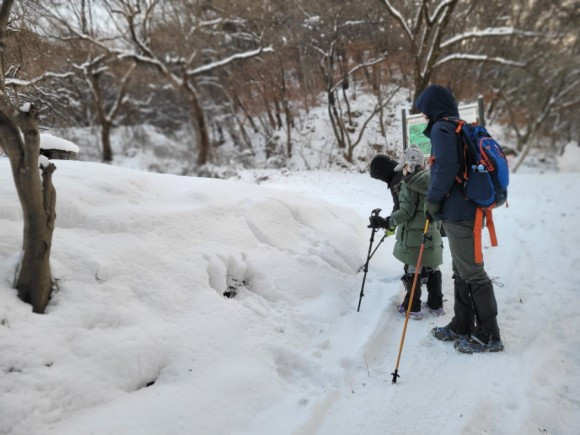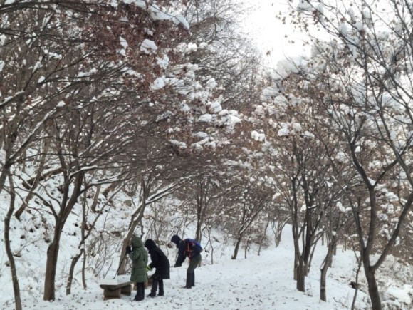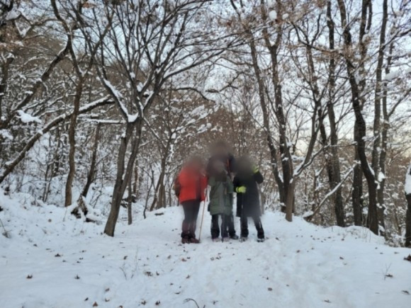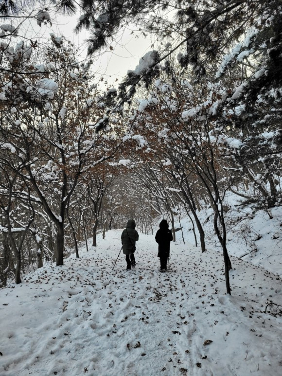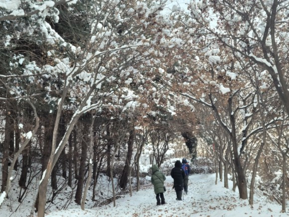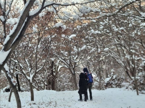우리는 산 중턱까지만 가기로 하고 등산을 시작했다. 자주 오는 곳이라 힘들지는 않았다. 아이들은 박두진 문학관에서 한바탕 놀고 온 탓에 양말은 이미 젖어 있어 계속 춥다고 했다. 추워도 놀 건 또 놀아야 애들이지. 나무에 쌓여 있는 눈 흔들며 눈 맞는 재미에 집에 갈 줄 모른다.