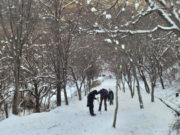 겨울 산행 시 준비물 : 아이젠(필수), 스패츠, 스틱, 비상약, 모자, 장갑, 물, 비상식량(초콜릿 등)