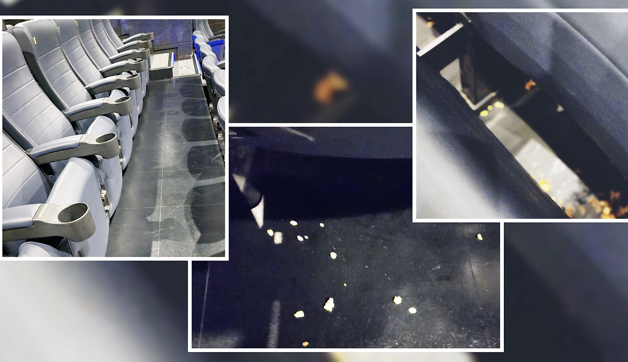 상영관 청소는 청소구역 중 가장 힘든 곳이다. 빗자루로 의자 밑을 다 쓸어야 하고 팝콘이 있는지 없는지도 잘 살펴보아야 한다. 게다가 의자가 접혀 있으면 보기에는 깨끗해 보여도 의자 밑 속을 쓸어 보면 어김없이 팝콘이 튀어나온다.