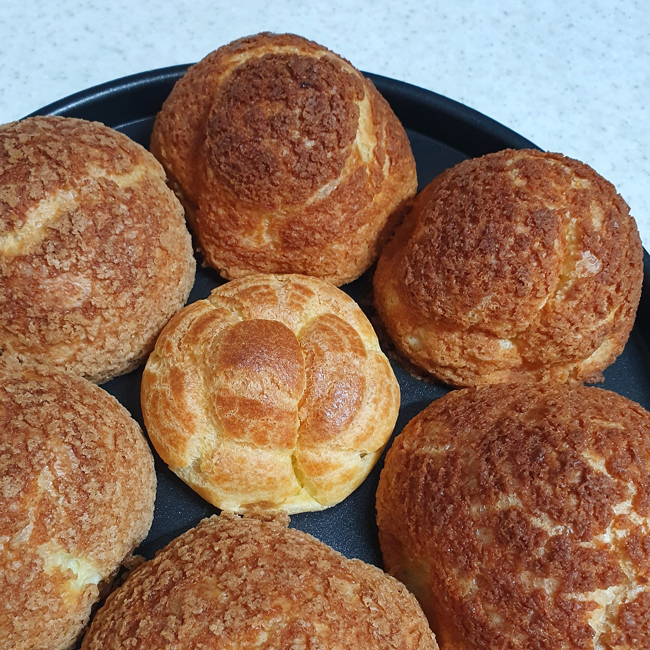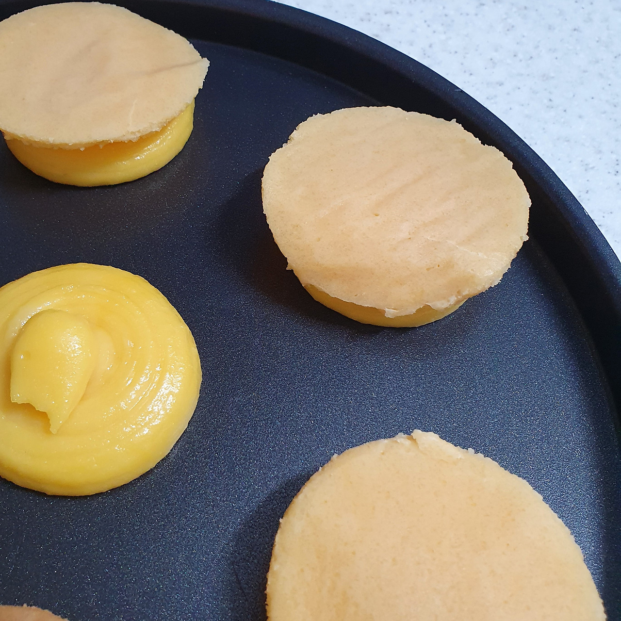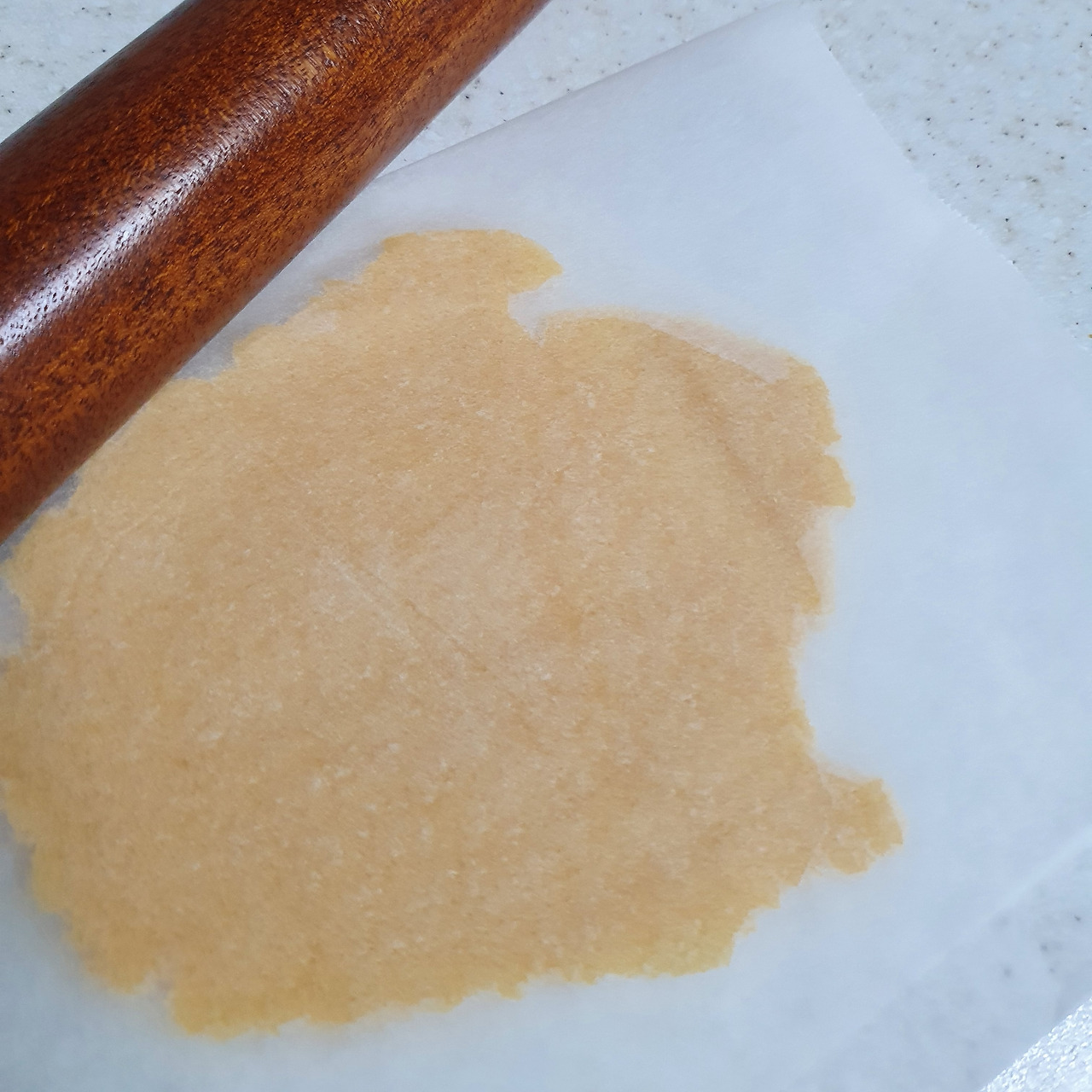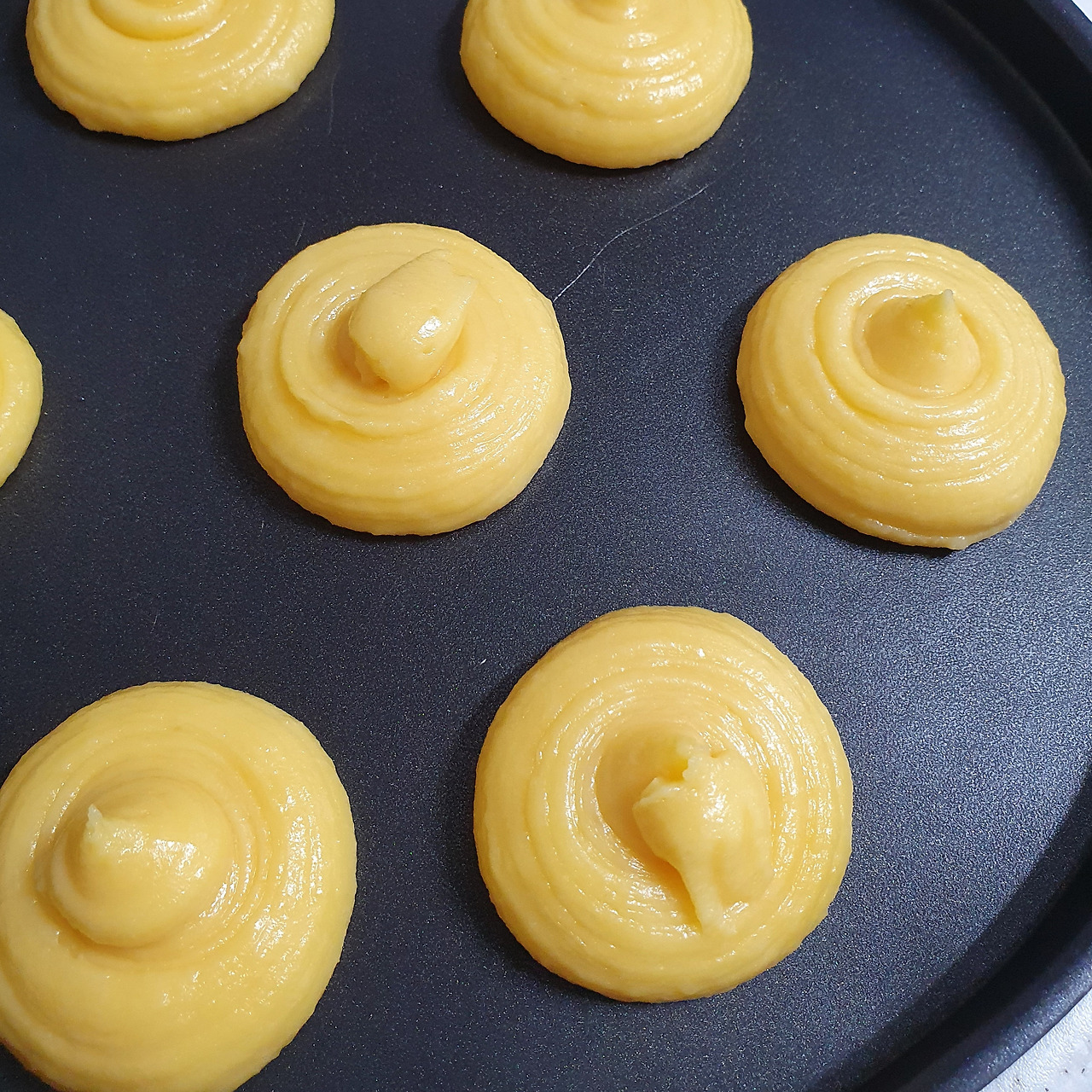 슈 반죽이 준비되면 미리 만들어 둔 쿠키 반죽을 위에 올린다. 옥수수와 어울리는 쿠키는 무엇일까 고민하다, 카라멜 쿠키를 만들기로 했다. 크림이 들어간 달콤하고 향긋한 카라멜이 아닌 씁쓸하고 투명한 맛의 태운 설탕을 카라멜로 사용했다. 옅은 초당옥수수의 향을 가리지 않으면서 자칫 지나칠 수 있는 단맛을 눌러줄 씁쓸한 맛을 가지고 있어 적당한 재료라고 생각했다.
