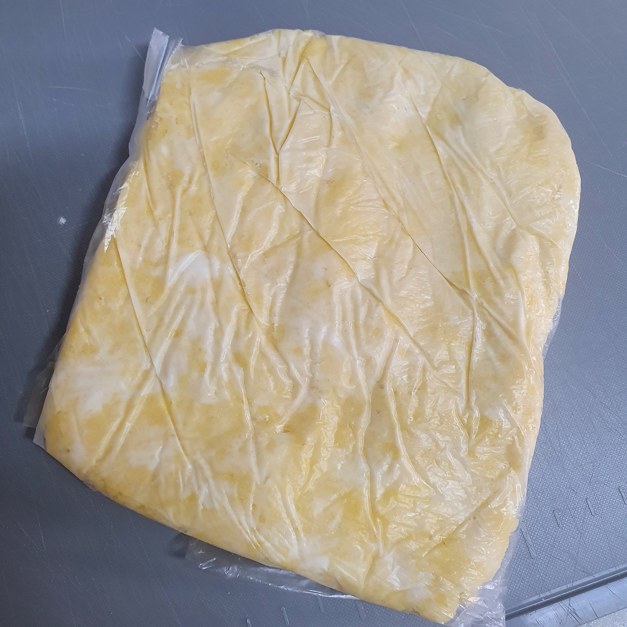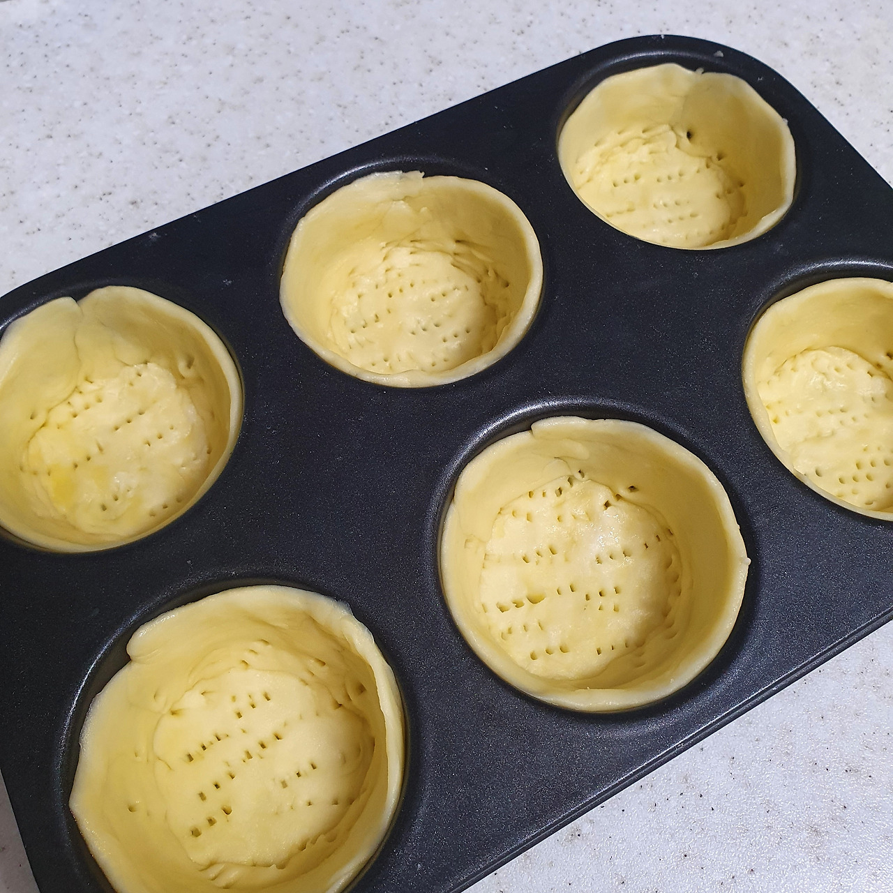 반죽이 끝나면 냉장고에서 충분히 차갑게 만들어준다. 군데군데 덩어리 진 버터가 나중에 반죽 사이 층을 만들 수 있게 말이다. 버터가 굳을 정도로 차가워진 반죽은 원하는 틀에 맞추어 모양을 잡는다. 아래쪽이 솟아오르지 않도록 바닥에 구멍을 내는 것도 잊지 말자.