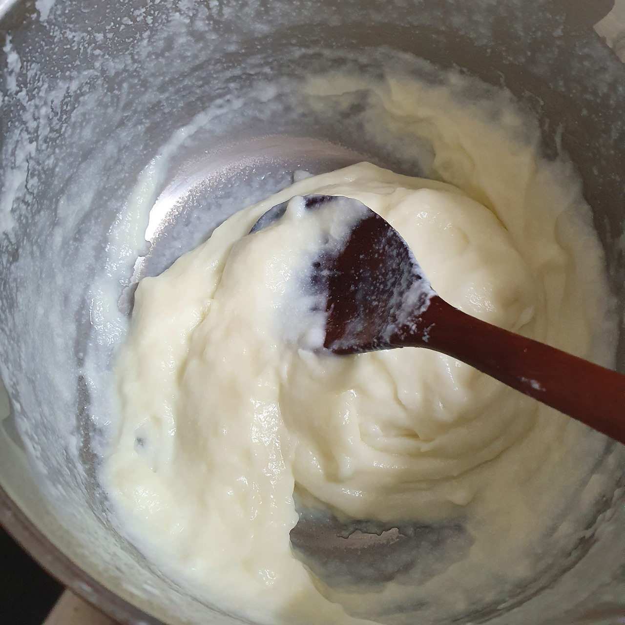 전분은 열이 닿으면 쉽게 응어리지는데, 때문에 필링을 중간에 한번 체에 걸러주는 편이 좋다. 그리고 너무 꾸덕해지지 않도록 상태를 계속 살펴야 한다. 열심히 저을수록 매끈하고 부드러운 필링이 완성되기 때문에, 오른손 왼손 할 것 없이 열과 성을 다해 저어주자. 그러다 보면 틀은 충분히 식고, 필링은 윤기가 흐를 것이다.