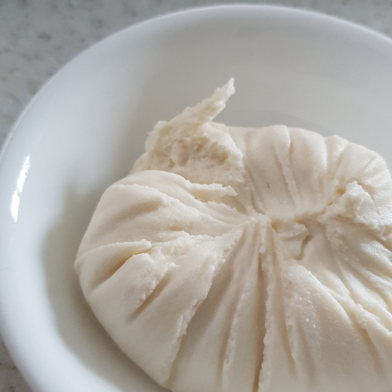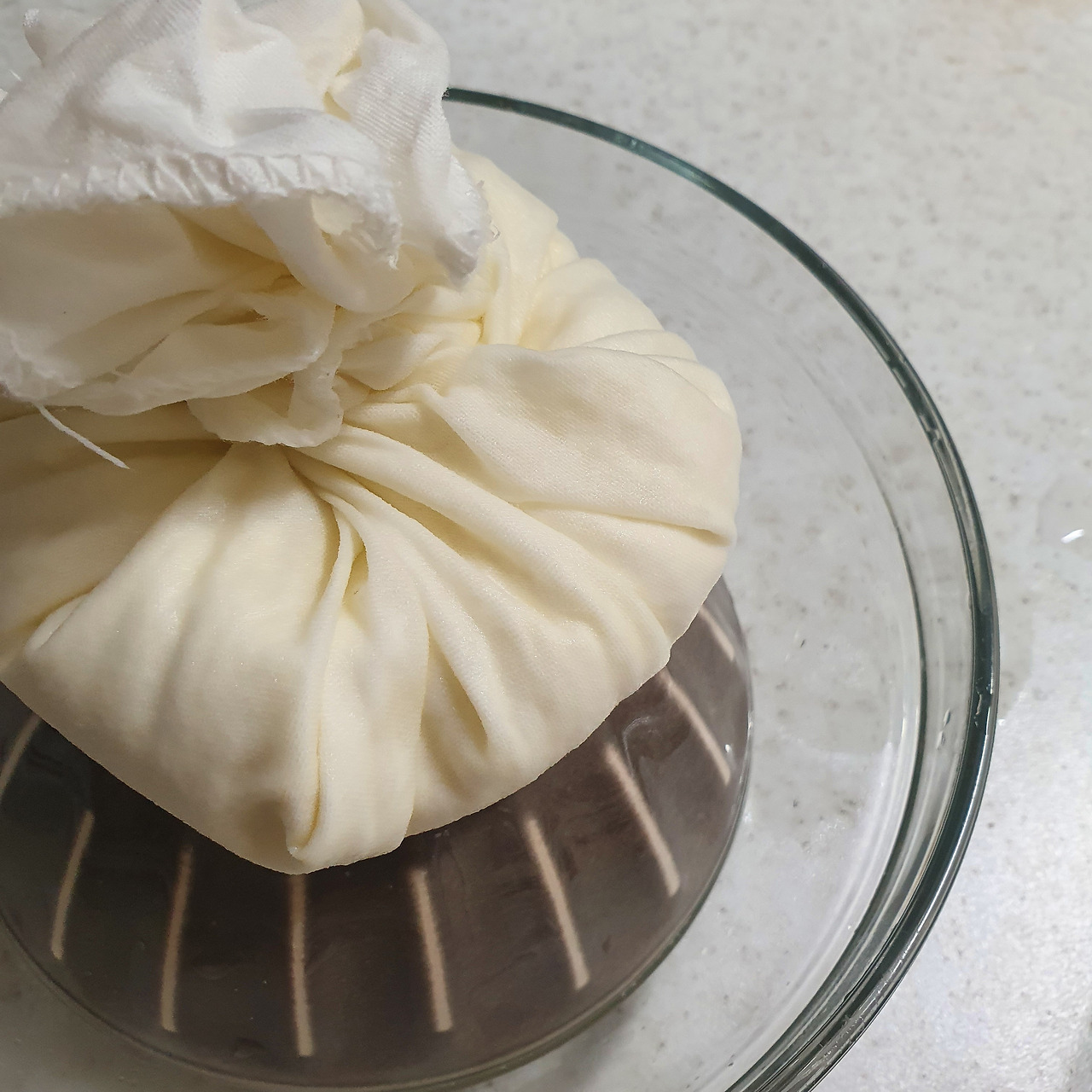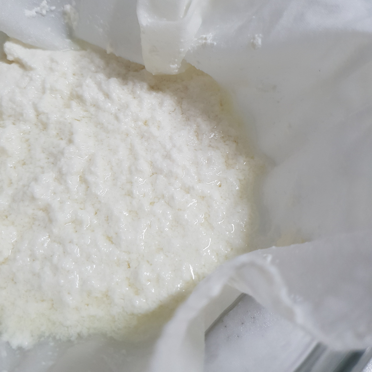 몽글몽글 우유로 만든 순두부 같은 모양이다. 아래로 반투명한 유청은 걸러지고 하얀 유단백 부분은 면보 위에 걸러진다.